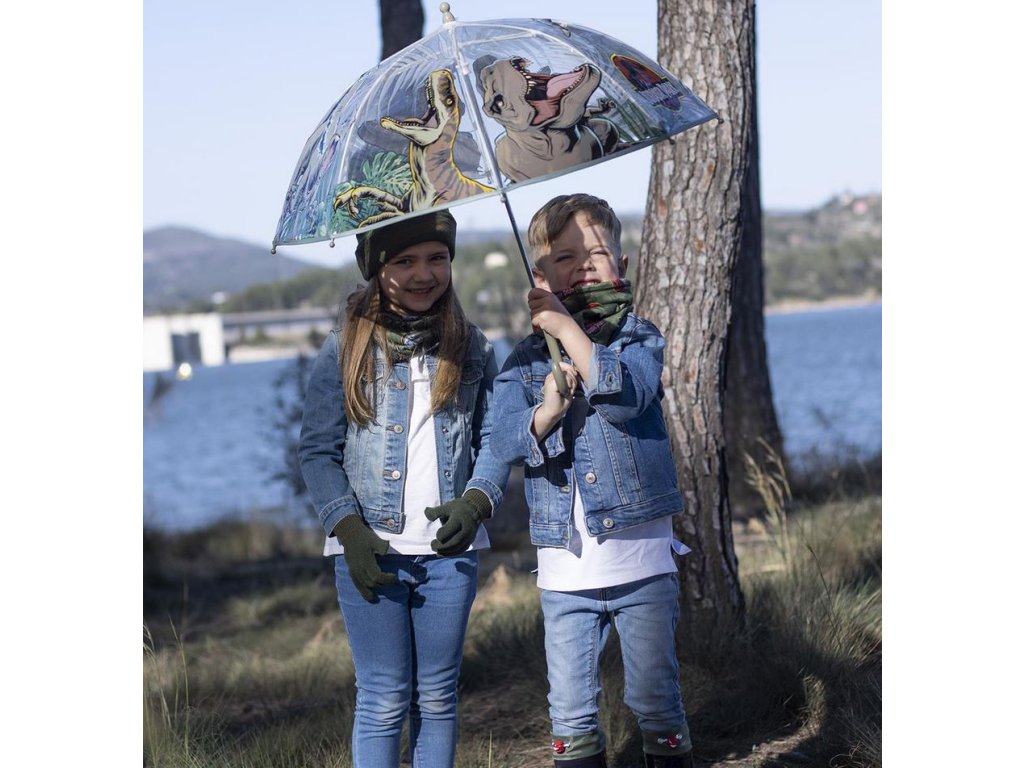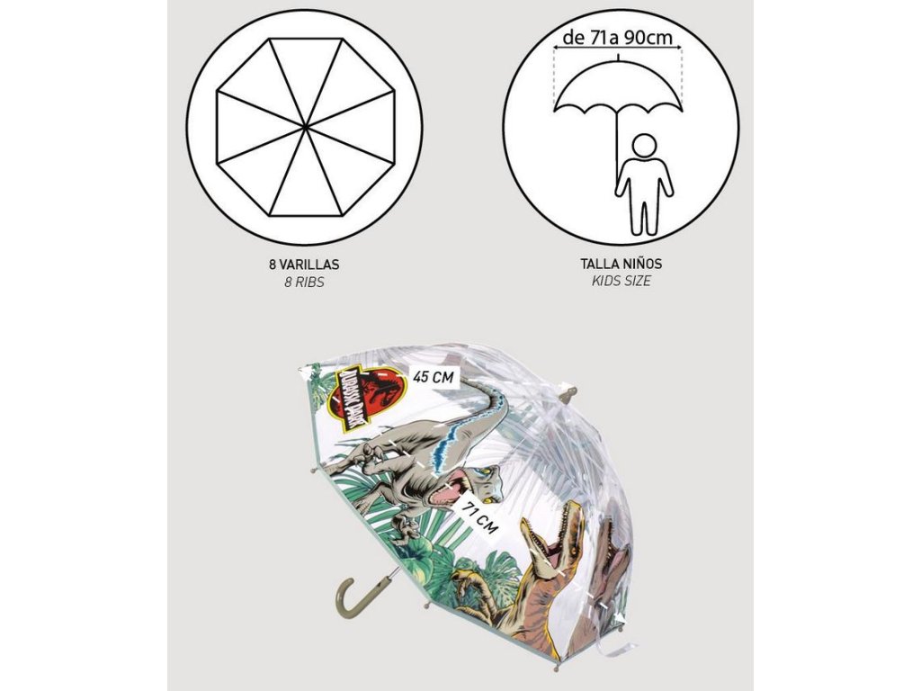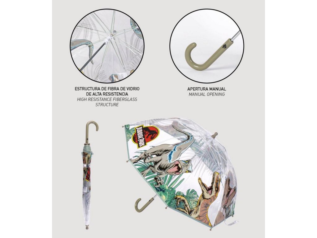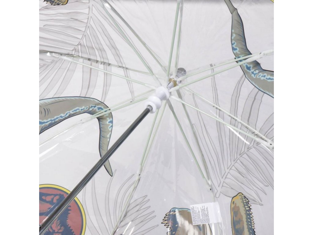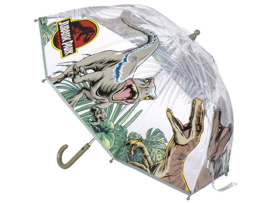 Atraktivní čirý deštník s grafikou a motivem Jurského parku.
