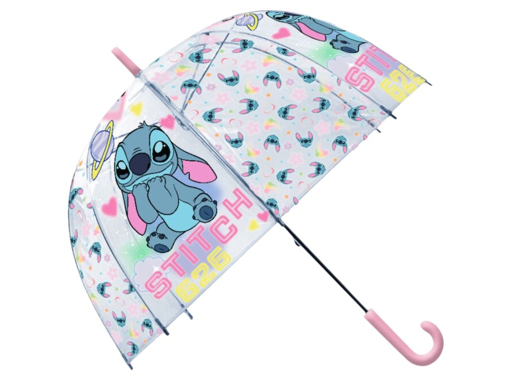 Manuální deštník v průhledné transparentní barvě s designem a barevnými detaily mimozemšťana Stitche z pohádky Lilo a Stitch. Deštník je vyroben z vysoce kvalitních materiálů a díky robustní konstrukci v kopulovitému tvaru děti ochrání před nepříjemným větrem a deštěm. Deštník má plastovou ohnutou rukojeť pro snadné držení i v nepříznivém počasí. Lehké manuální otevření a zavření deštníku zvládnou i menší děti, které si tento doplněk do deště určitě zamilují.
