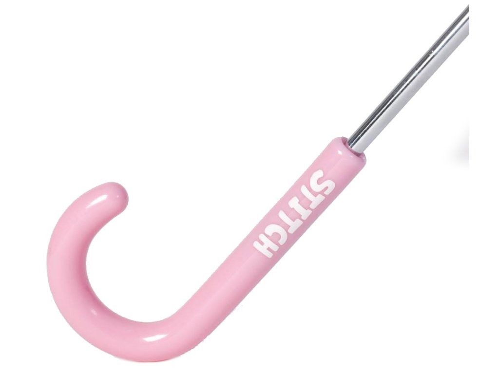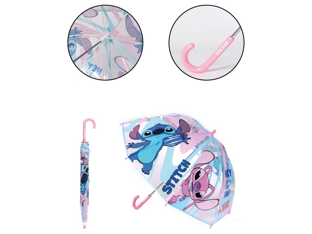 Manuální deštník s průhledným designem a barevnými detaily postavy Stitche a Angel. Deštník má plastovou ohnutou rukojeť.