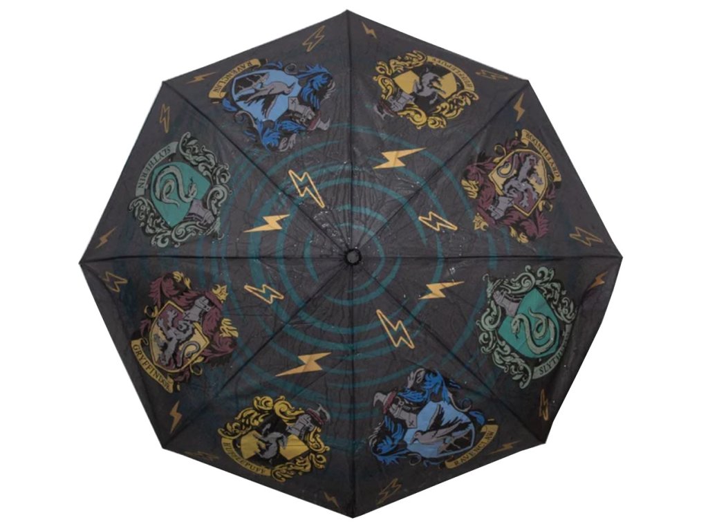Kouzelnický deštník s grafikou kolejí ze Školy čar a kouzel v Bradavicích pro všechny fanynky a fanoušky příběhů a dobrodružství Harry Pottera. Pravá magie nastane, když se deštník dostane do kontaktu s vodou a erby bradavických kolejí změní barvu!