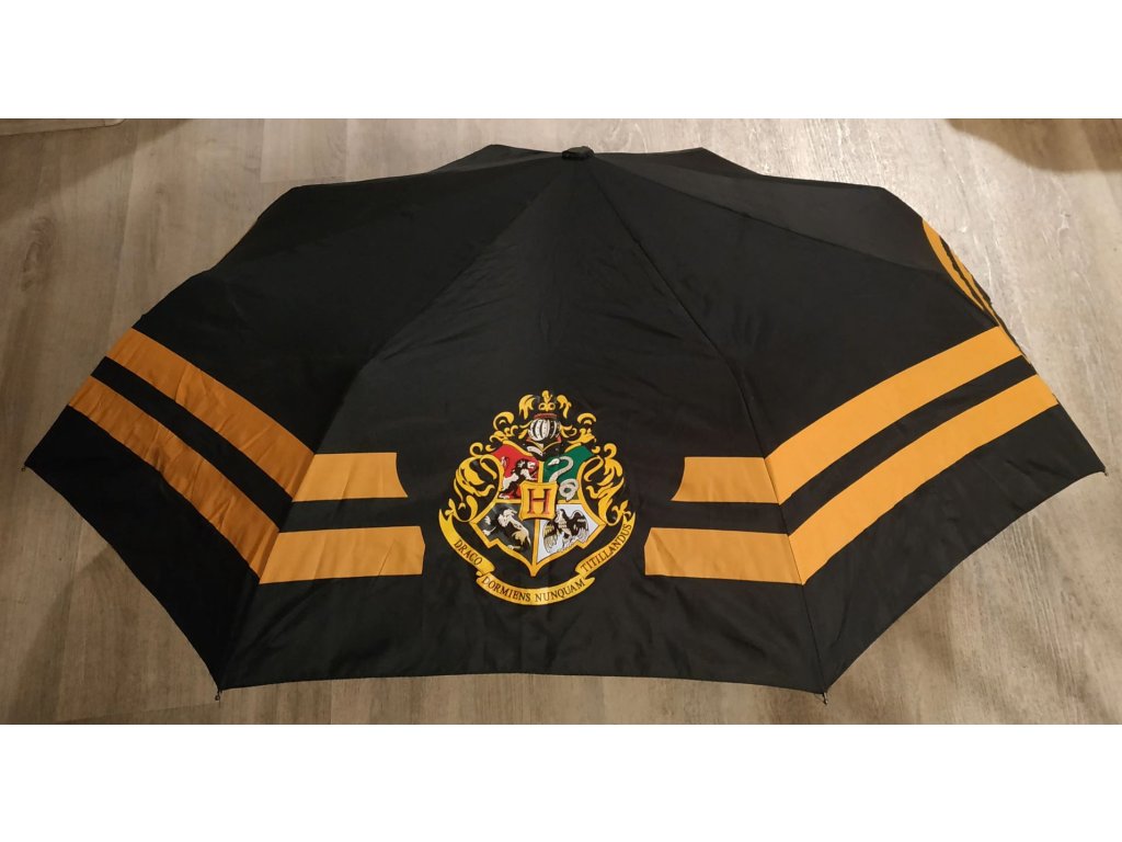 Skládací deštník černé barvy s logem a grafikou čarodějnické školy čar a kouzel: Bradavice, z filmové a knižní ságy Harry Potter.