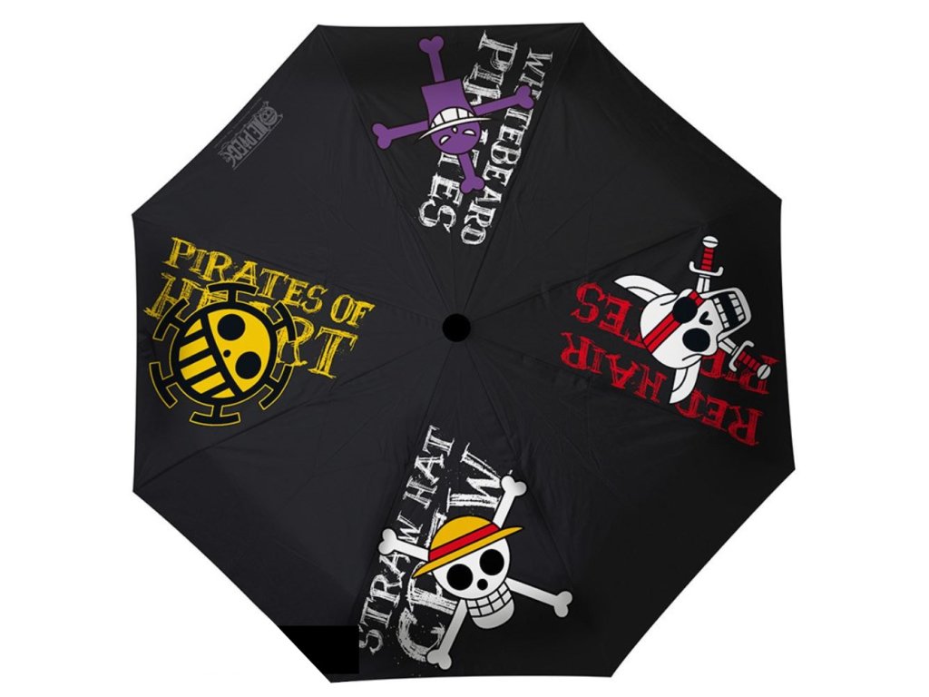 Pro vaše dlouhé cesty po moři za deštivého počasí je tu pro vás deštník One Piece se symboly různých ikonických posádek.