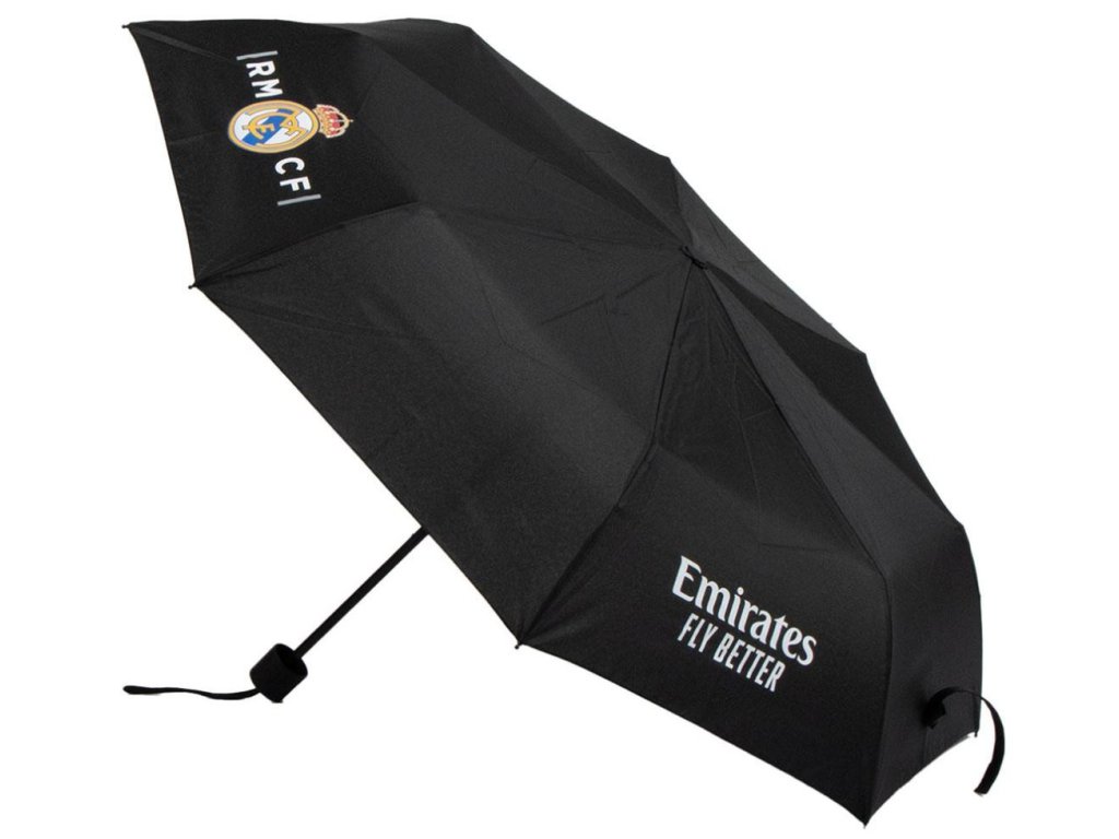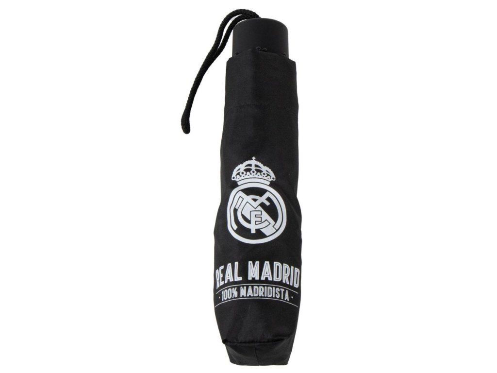 Černý deštník s grafikou loga a nápisů fotbalového týmu Real Madrid FC! S tímto deštníkem si už nemusíte nechat ujít žádný zápas, protože vás ani déšť neomezí, a i tak budete moci ukazovat svou lásku k týmu Real Madrid.