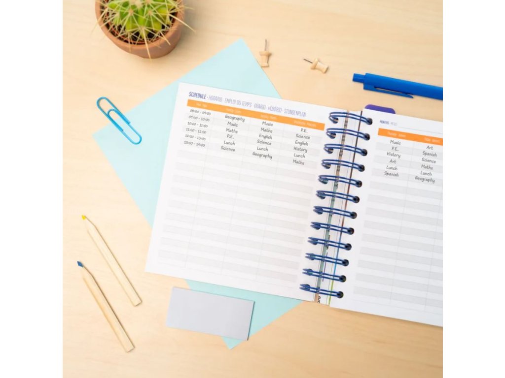 Vazba drátěného typu, s gumičkou, pravítkem s funkcí záložky, 8 oddělovacích listů, 16 ilustrací, 2 strany samolepek a 1 vnitřní obálka.
