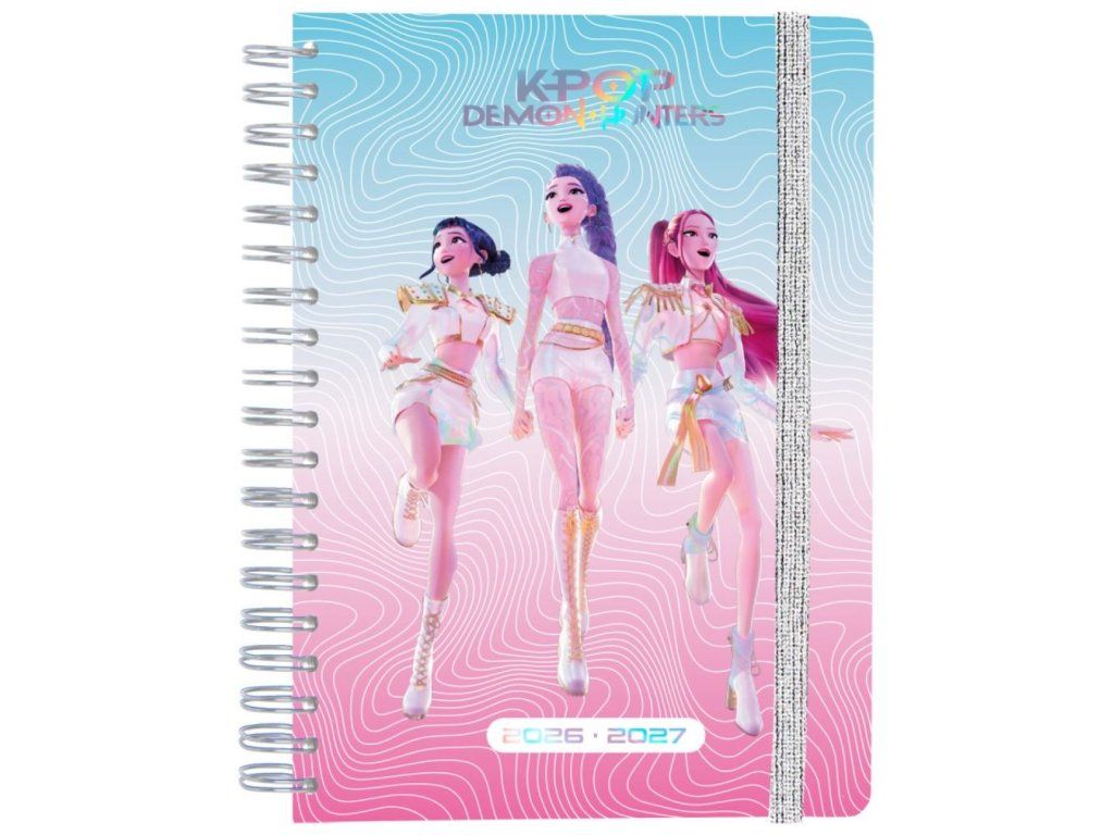 Oficiální produkt - školní 12 měsíční diář v kroužkové vazbě na rok 2026/2027 z katalogu kancelářských a dárkových produktů s licencí pohádky Demon Hunters (Lovkyně démonů).