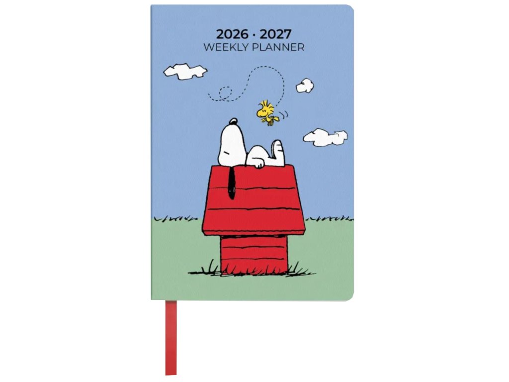Oficiální produkt - školní kapesní 17 měsíční diář v lepené vazbě na rok 2026/2027 z katalogu kancelářských a dárkových produktů s licencí oblíbeného psa Snoopyho.