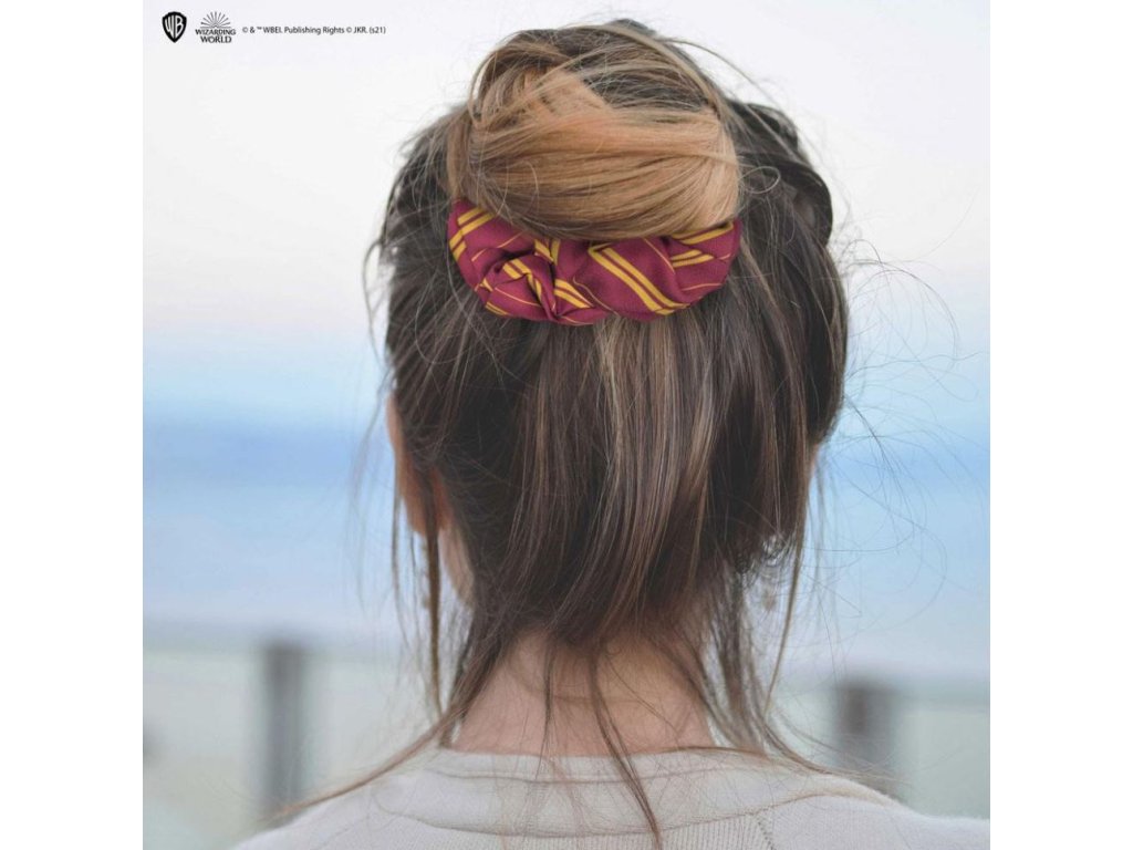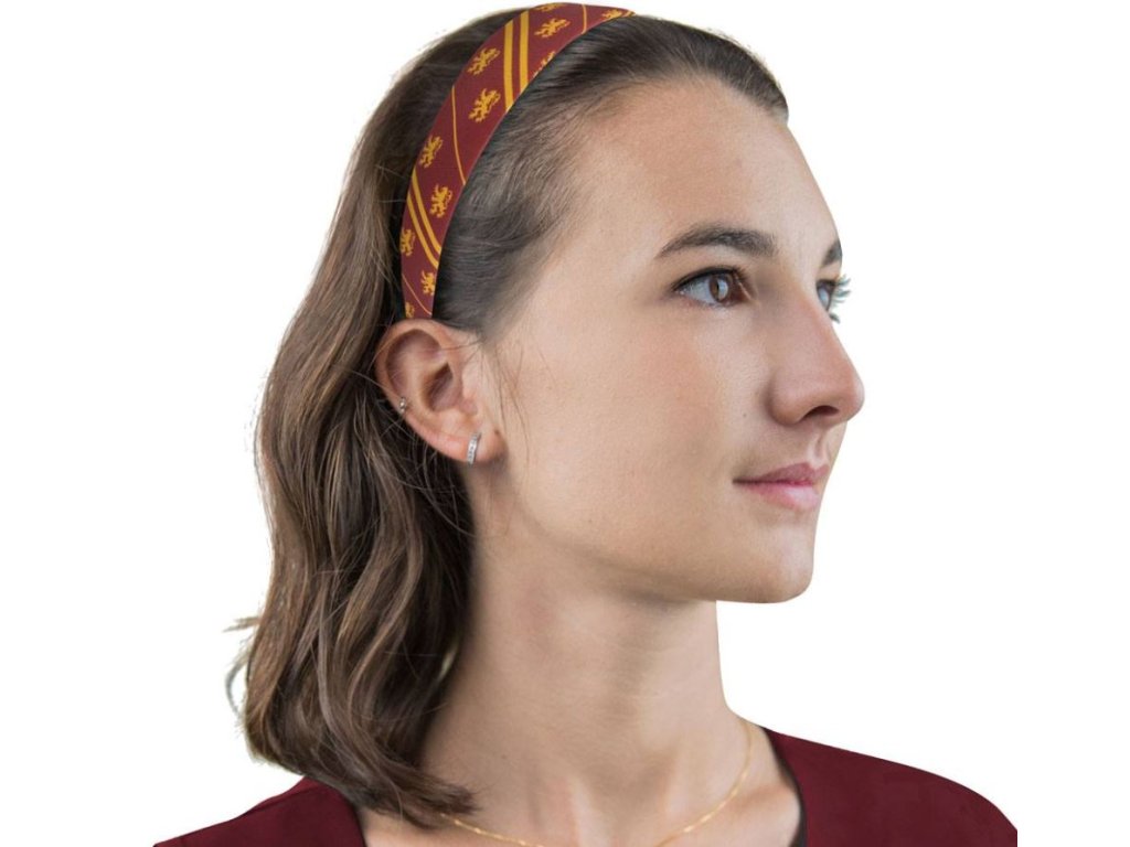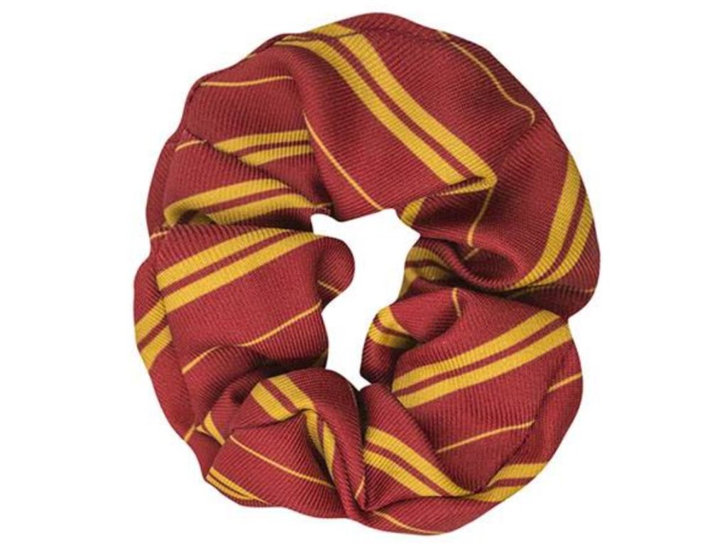 Tento červený set vlasových doplňků se žlutými detaily je inspirovaný školní kolejí Gryffindor (Nebelvír) a obsahuje čelenku se scrunchie gumičkou.