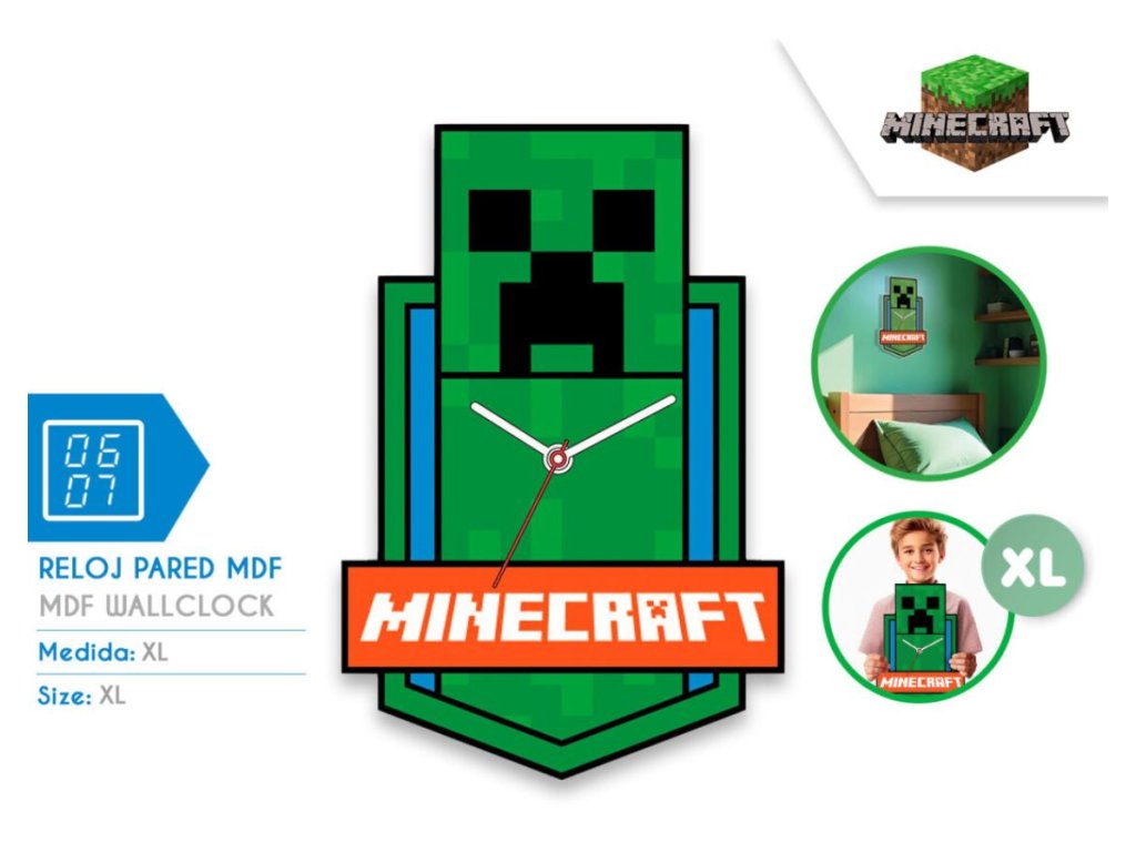 Oficiální produkt - nástěnné hodiny z katalogu zboží s grafikou a licencí populární počítačové hry v otevřeném světě Minecraft.