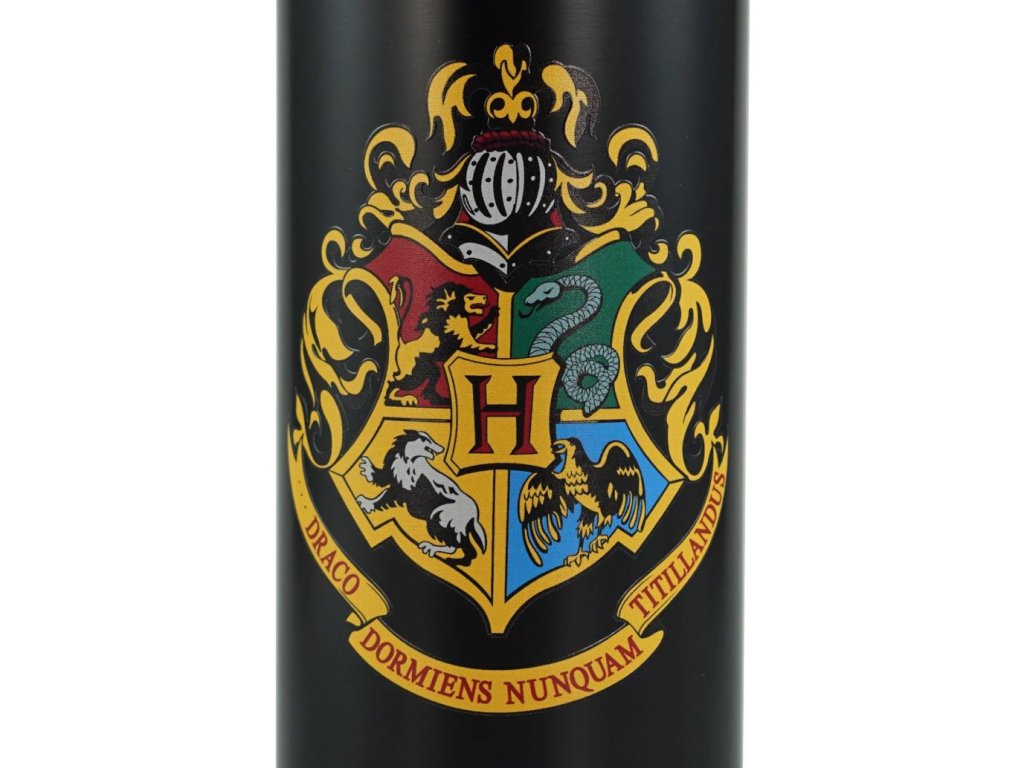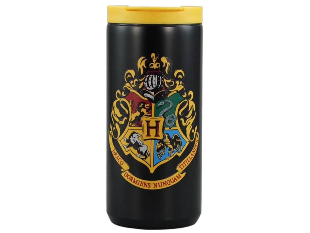 Černý cestovní hrnek s grafikou znaku kouzelnického hradu Bradavice a nápisem ,,Hogwarts" je ideální pro dlouhé dojíždění i krátké procházky do města. Hrnek je z nerezu s lehce otevíratelným odolným plastovým víčkem.