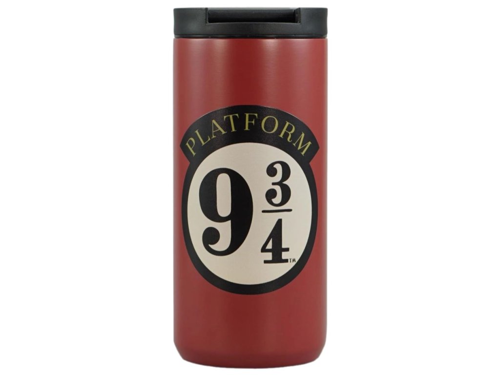 Červený cestovní hrnek s grafikou nástupiště 9 a 3/4 a nápisem ,,Hogwarts express" je ideální pro dlouhé dojíždění i krátké procházky do města. Hrnek je z nerezu s lehce otevíratelným odolným plastovým víčkem.