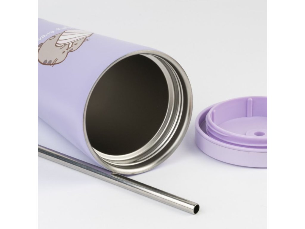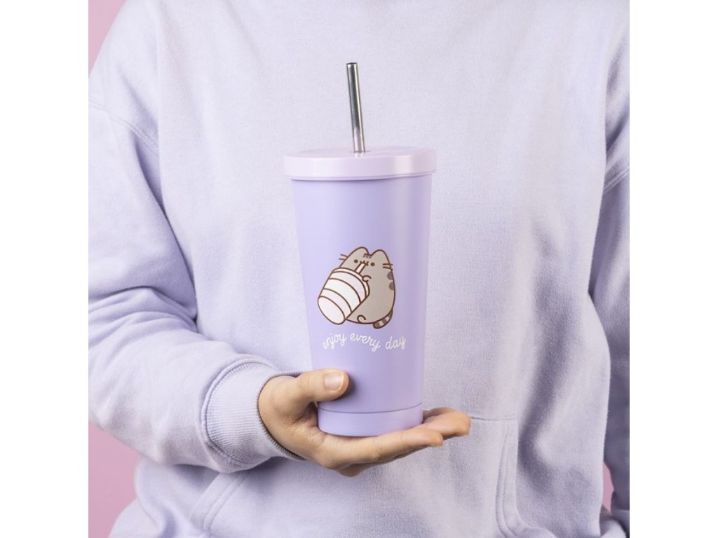 Oficiální produkt - cestovní hrnek s víčkem a brčkem z doplňkového zboží z katalogu výrobů s grafikou a licencí slavné animované kočičky Pusheen.