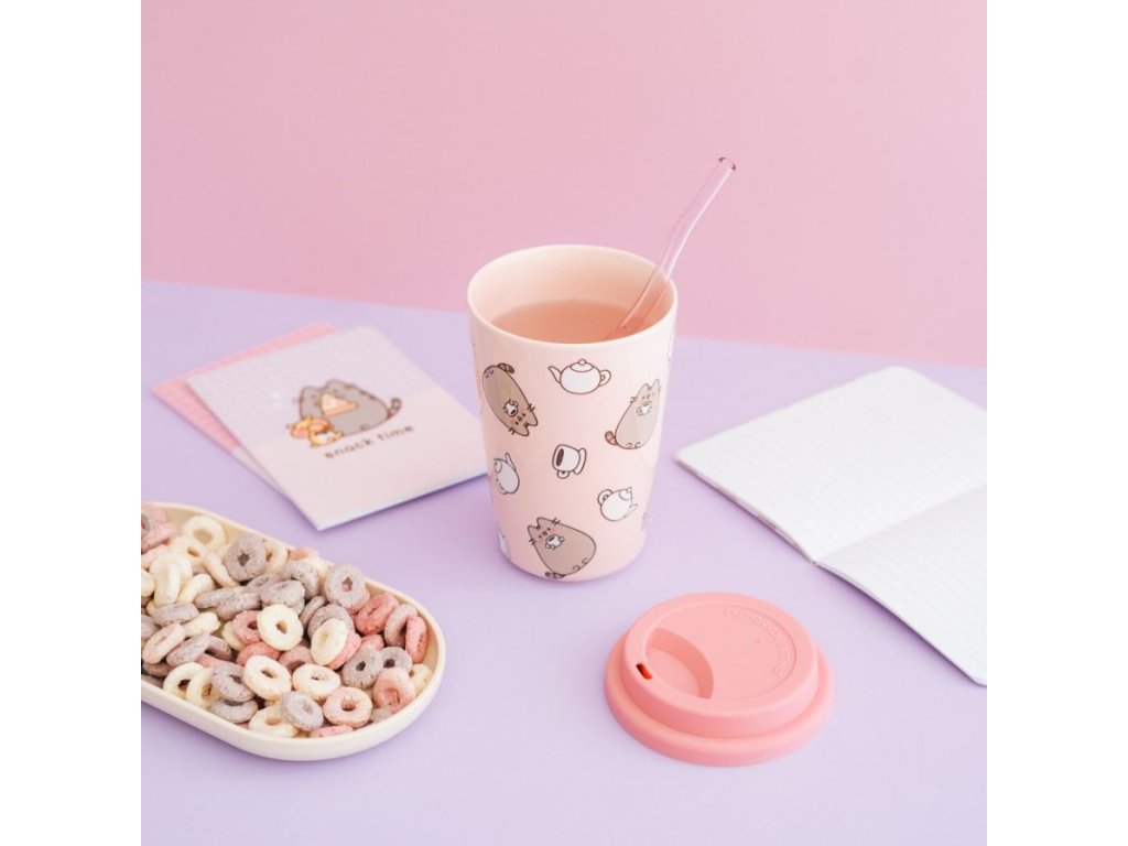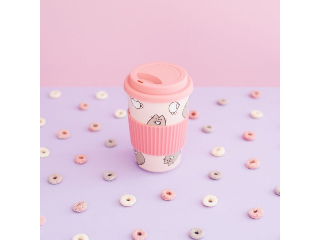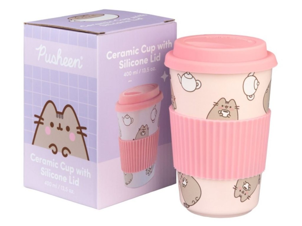 Oficiální produkt - cestovní hrnek s víčkem a doplňkové zboží z katalogu výrobků s licencí a grafikou animované kočky Pusheen.