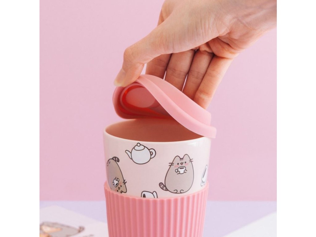 Lososovo-růžový cestovní hrnek inspirovaný a vyvedený s grafikou animované kočky Pusheen. Hrníček má odnímatelné víčko s otvorem pro pití nápoje. Hrnek je vhodným dárkem pro všechny menší i větší fanoušky této roztomilé kočičky Pusheen.