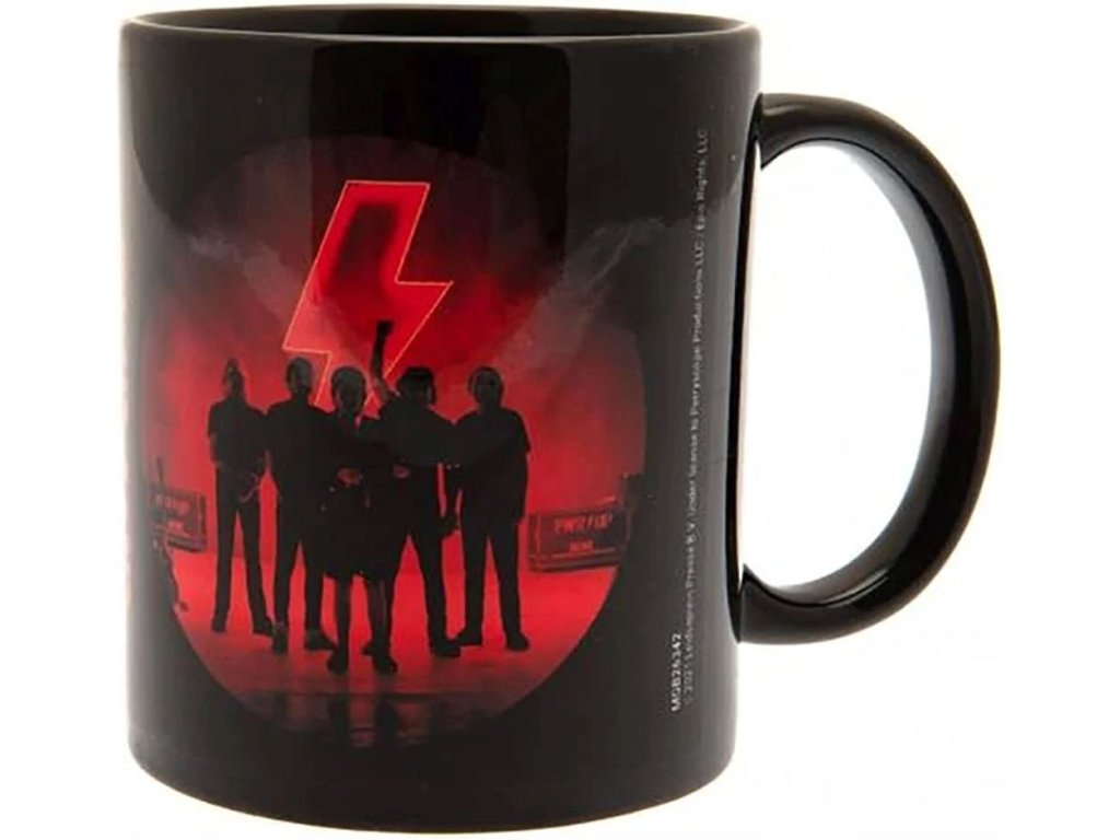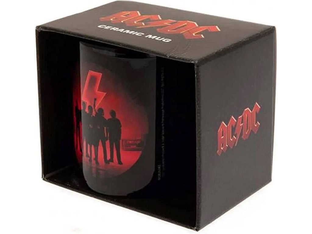 Černý keramický hrnek s červeným logem a motivem slavné hard-rockové skupiny AC/DC.