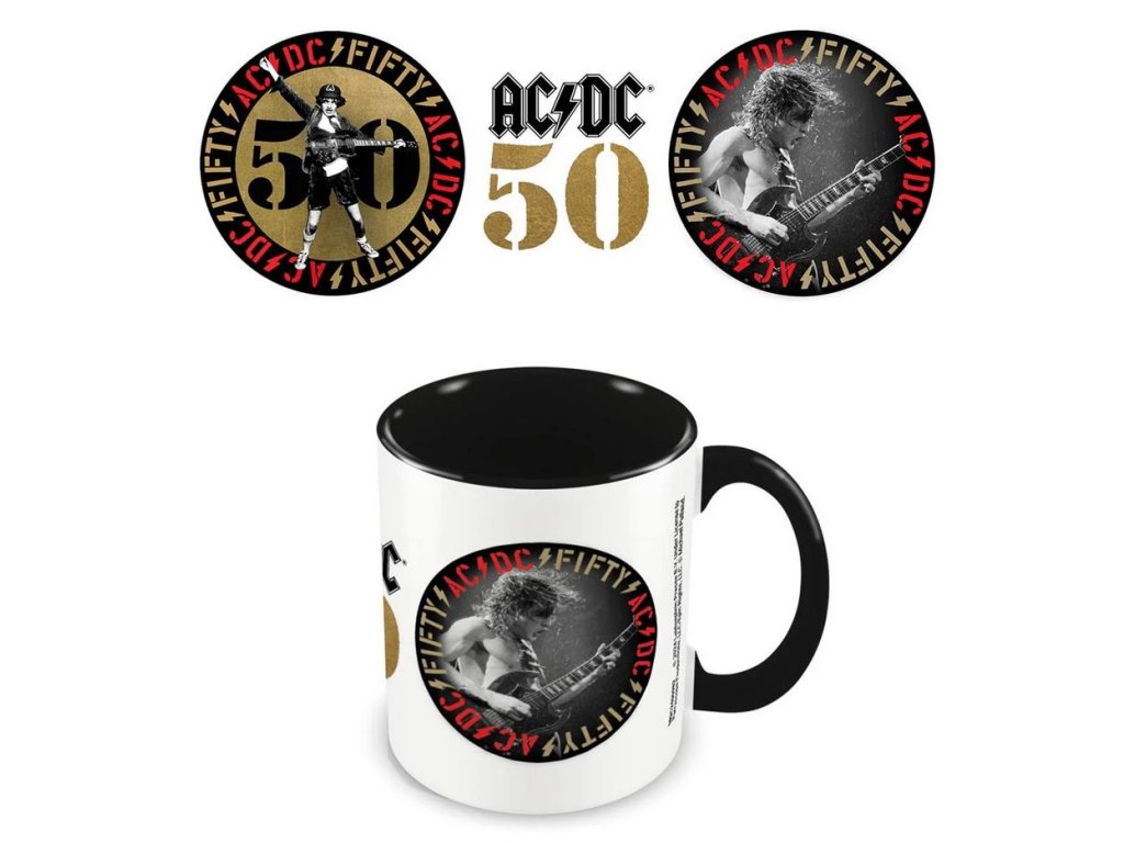 Černý keramický glazovaný hrnek s bílým potiskem a logem k 50. výročí slavné rockové hudební skupiny AC/DC. Hrnek je vhodným dárkem pro všechny hudební fanoušky.
