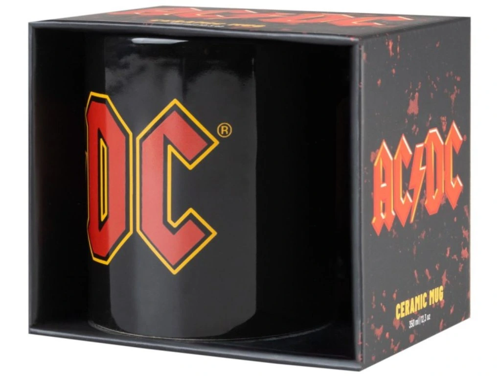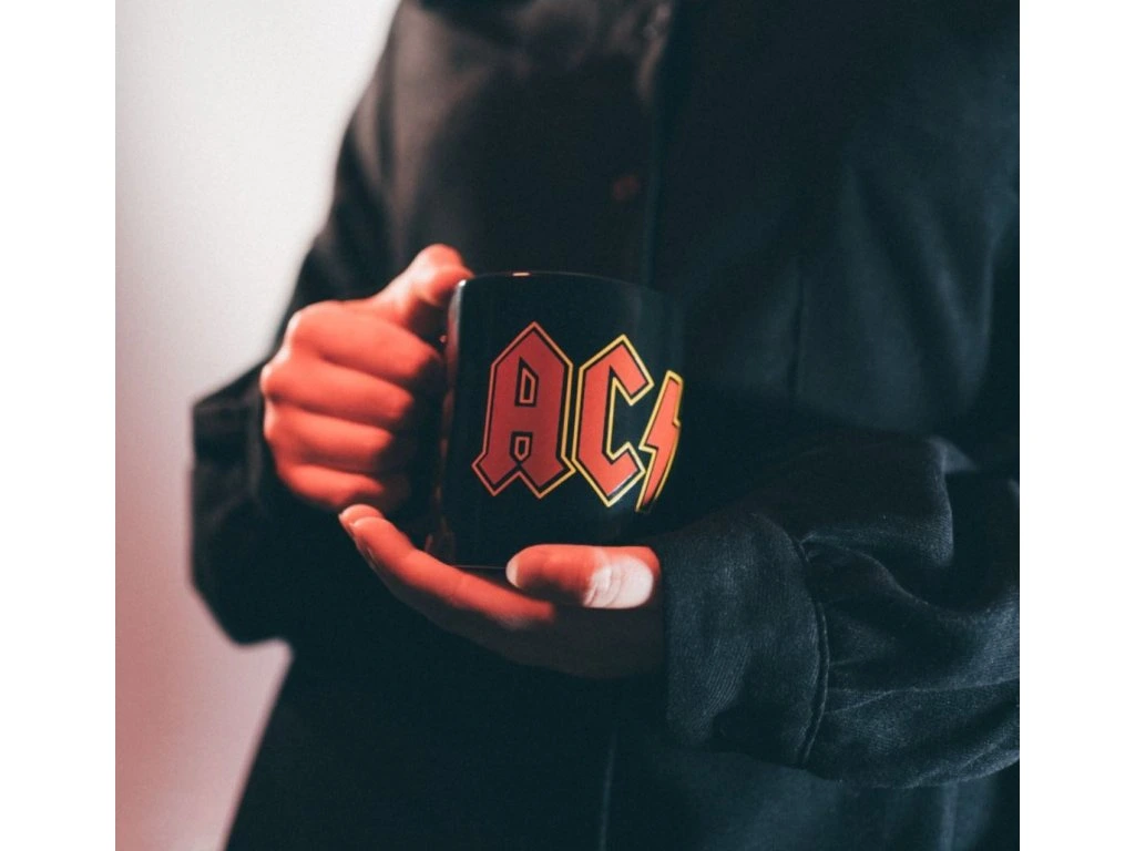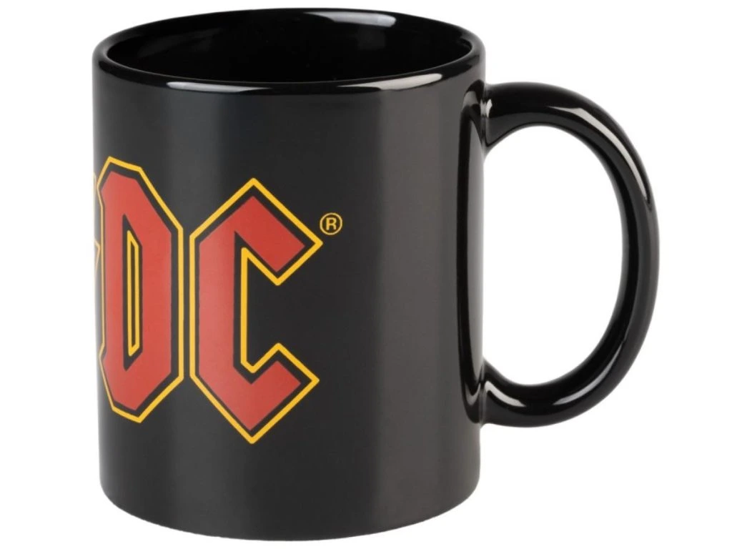 Černý keramický glazovaný hrnek s potiskem klasického loga slavné rockové hudební skupiny AC/DC. Hrnek je vhodným dárkem pro všechny hudební fanoušky, zláště ty, co milují skupinu AC/DC.