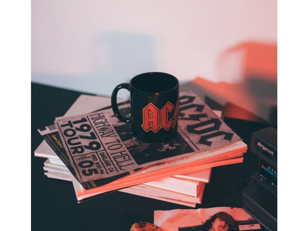 Oficiální produkt - keramický hrnek z katalogu výrobků s logem, fotografiemi a grafikou populární australské rockové hudební skupiny AC/DC.