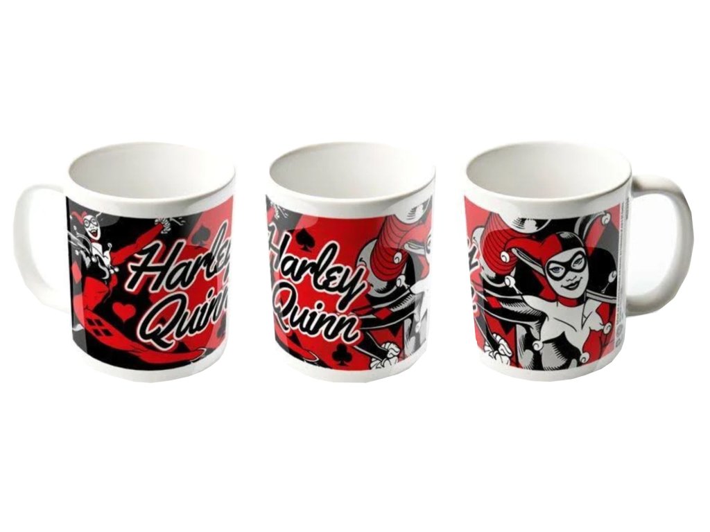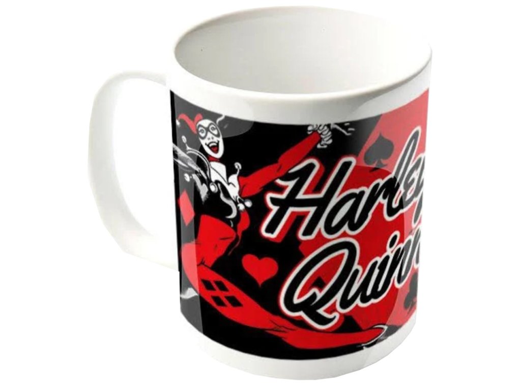 Oficiální hrnek z katalogu produktů s logem, fotografiemi a grafikou fiktivní postavy jménem Harley Quinn.
