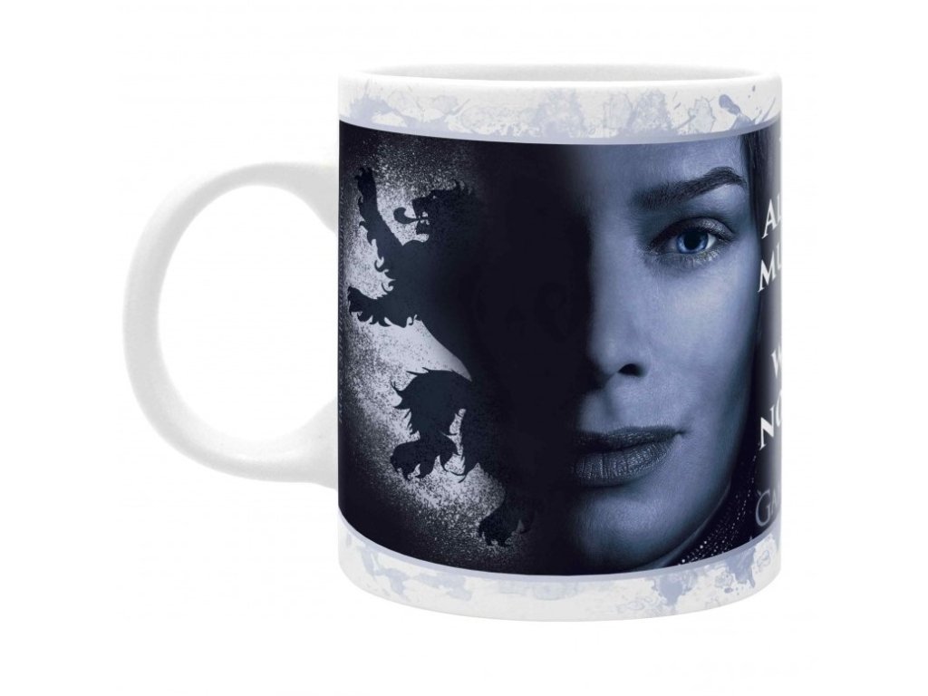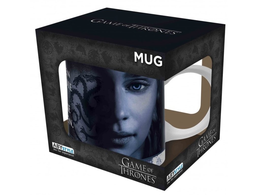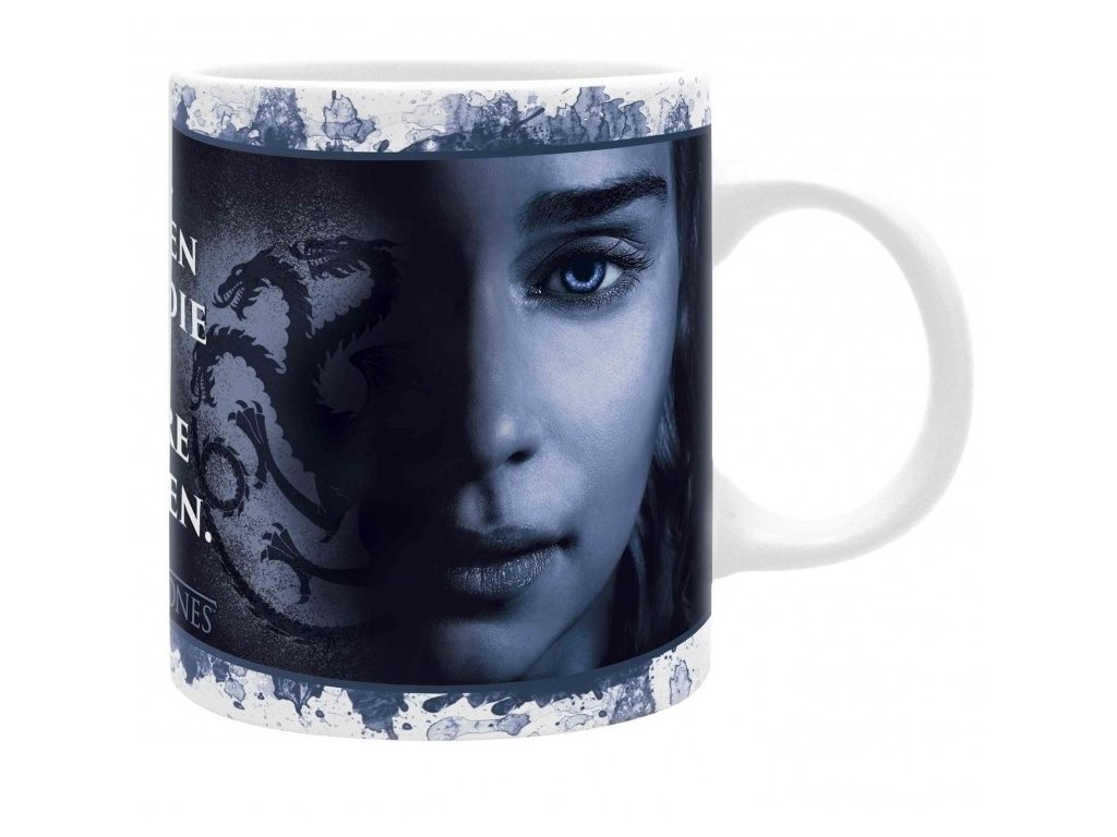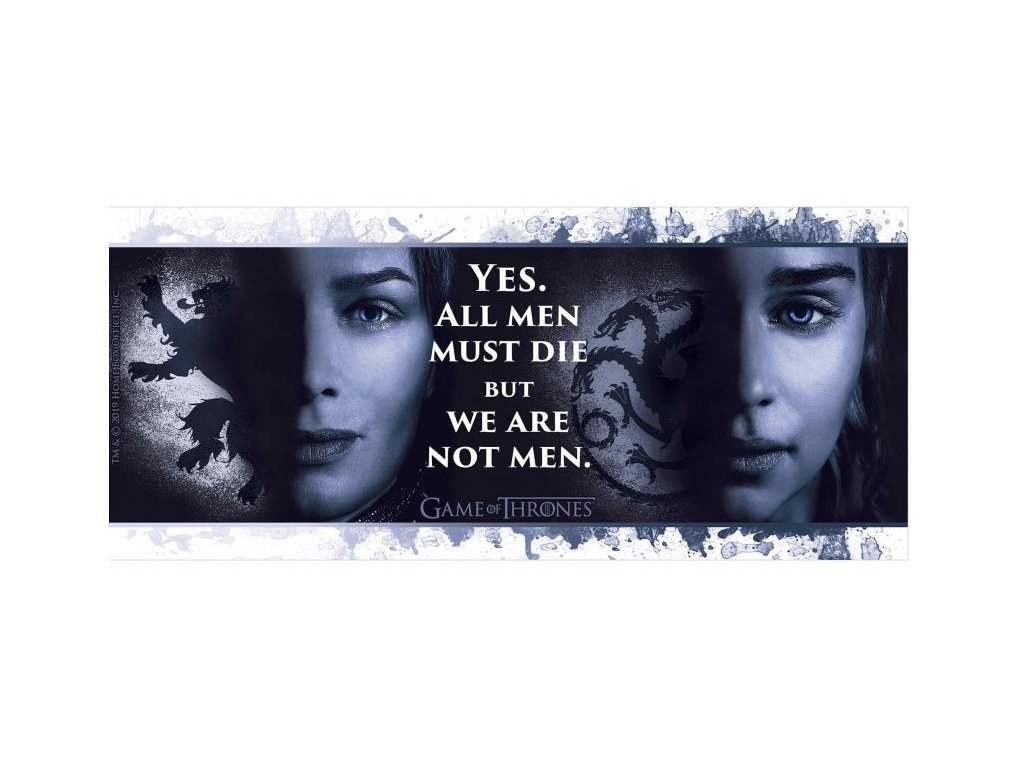 Bílý keramický hrnek s logem seriálu Game Of Thrones. Obsahuje větu: "Yes. All men must die, but we are not men." (v překladu: "Ano. Všichni muži musí zemřít, ale my nejsme muži."). Fotografie na hrníčku zobrazuje dvě královny Daenerys a Cersei. Otázkou je, která z nich skončí na železném trůně?