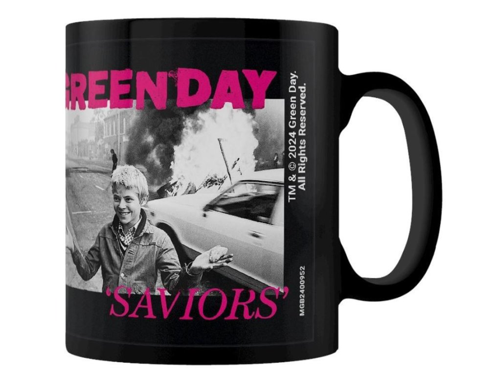 Černý keramický hrnek s grafickým potiskem inspirovaným albem Saviors od americké punk rockové skupiny Green Day. Hrnek je vhodným dárkem pro každého fanouška této americké punkrockové kapely.