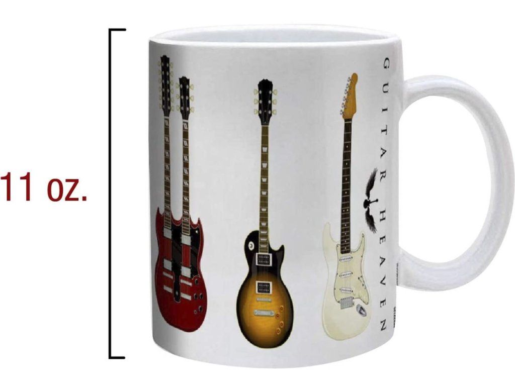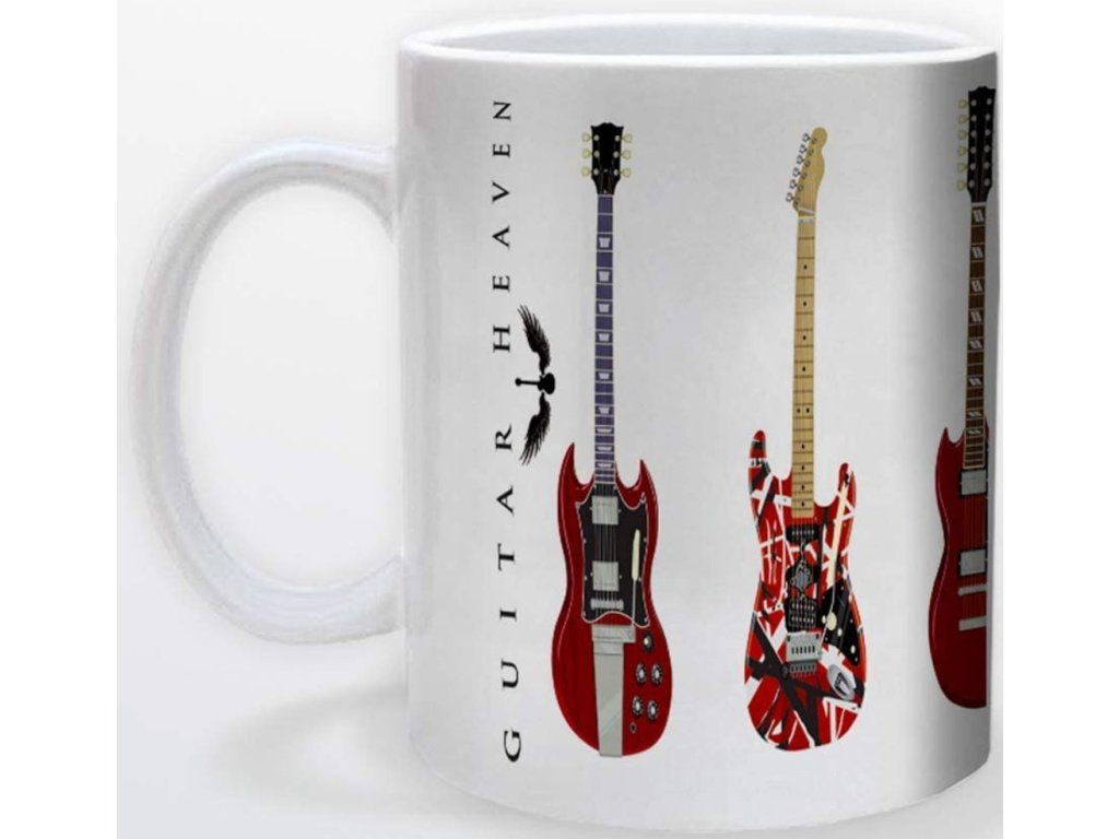 Bílý keramický hrnek s potiskem kytar z Guitar Heaven: Classic. Klasické rockové album zahrnující hostující vystoupení několika populárních zpěváků.