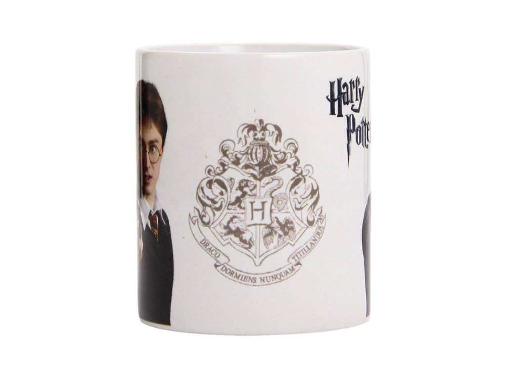 Bílý, keramický glazovaný hrnek s barevnou fotografií Harryho Pottera a nápisem.