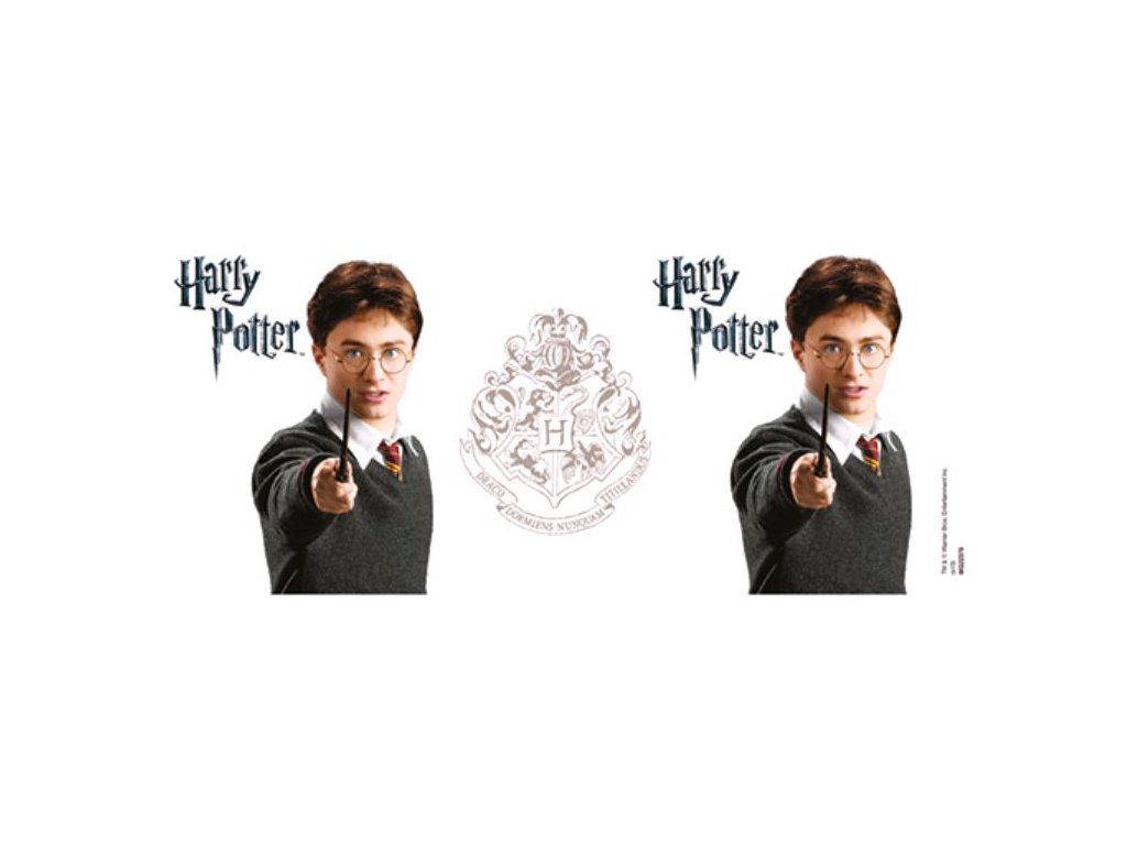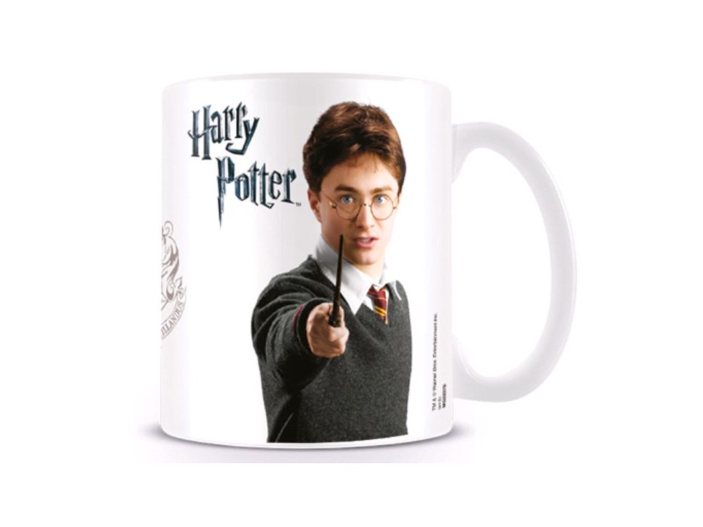 Oficiální hrnek a doplňkové zboží z katalogu produktů s logem, fotografiemi a grafikou filmové ságy o Harrym Potterovi.