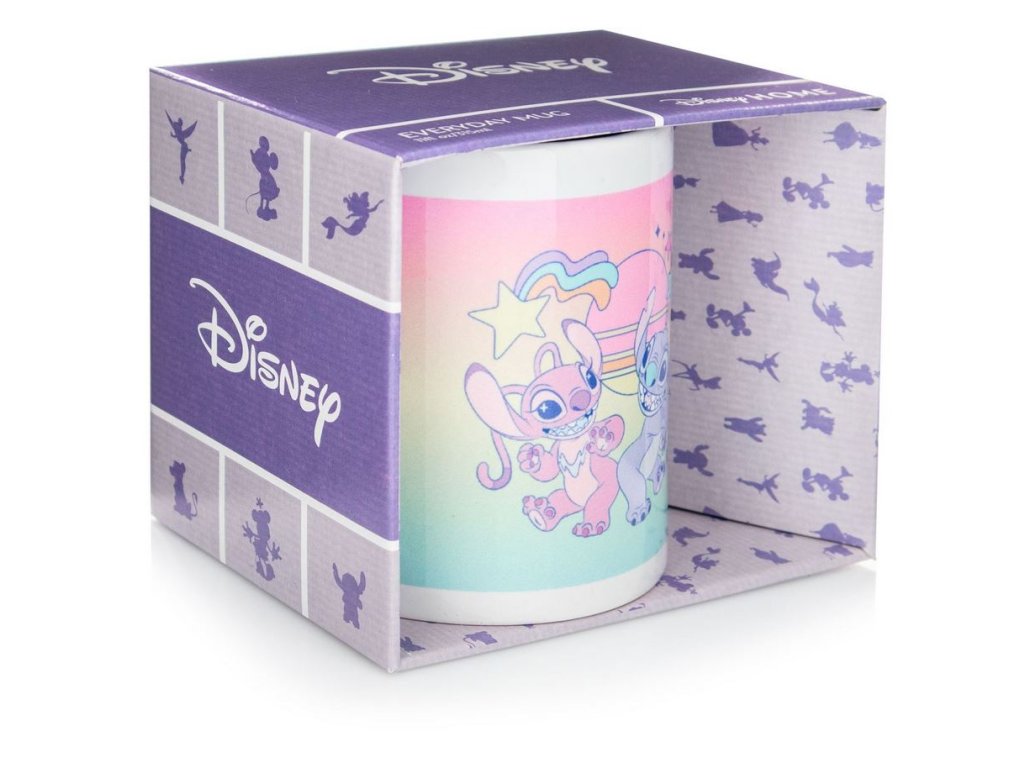 Bílý keramický hrnek s grafikou Stitche a Angel tančících pod duhou. Hrnek je vhodný pro všechny menší i větší fanoušky pohádky Lilo and Stitch od společnosti Disney.