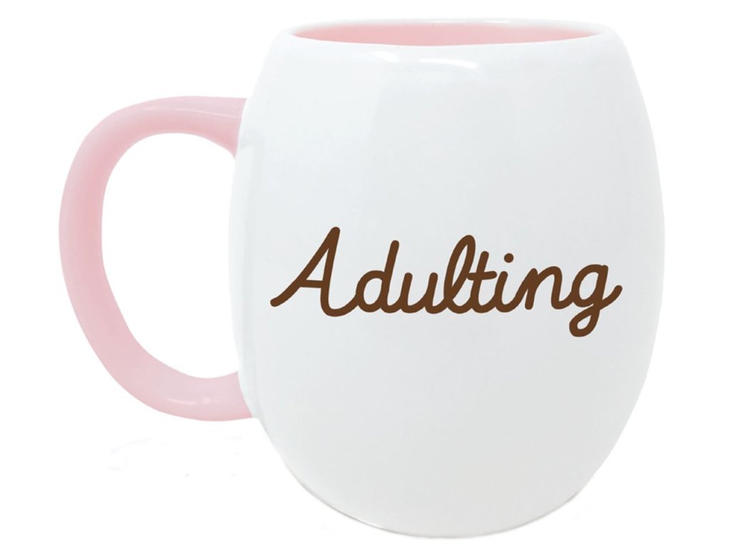 Růžový keramický hrnek s motivem kočky Pusheen Adulting.