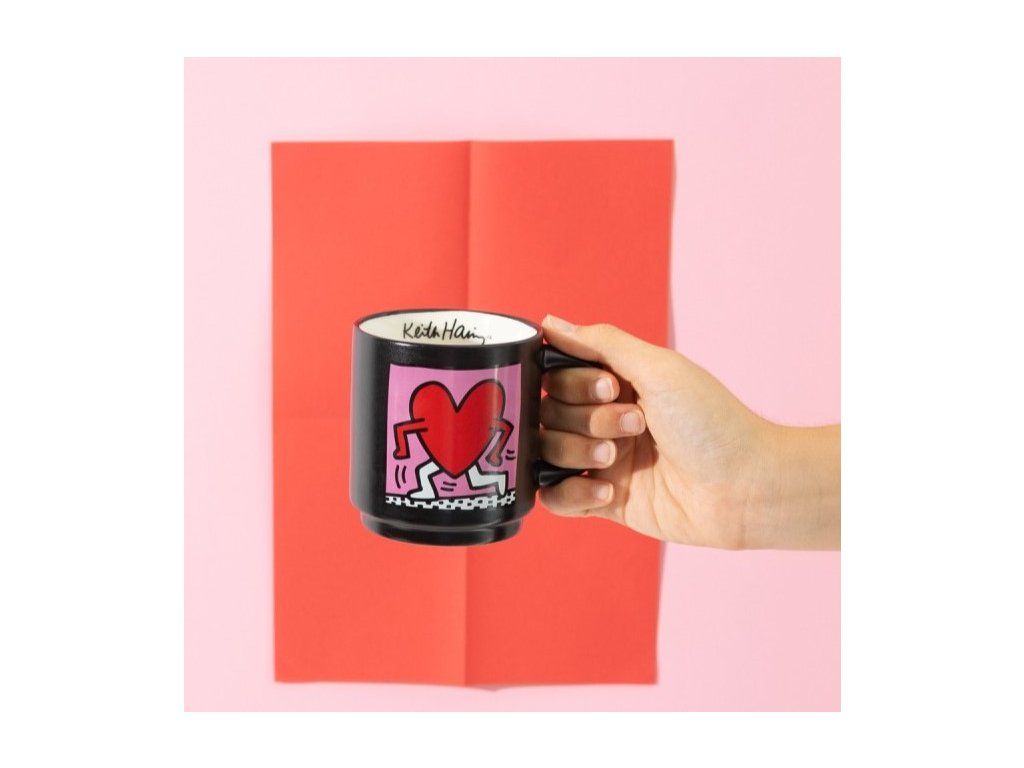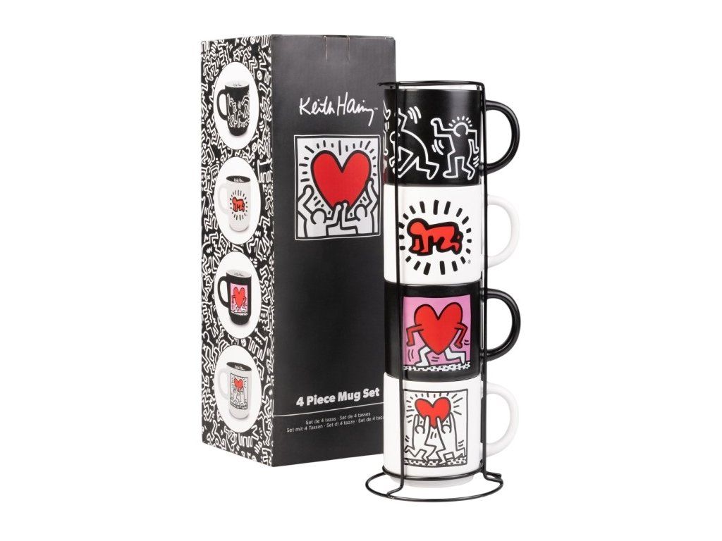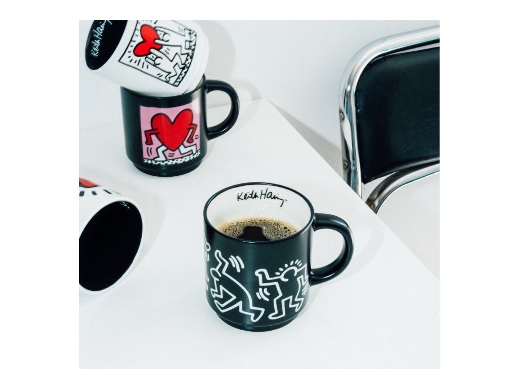 Set čtyř hrníčků s motivem Keitha Haringa. Keith Haring byl ikonický americký umělec, jehož dílo je známé výraznými liniemi a symboly, jako jsou tančící postavy nebo srdce. Šálky jsou umístěné na kovové podložce. Jsou vhodné do myčky a mikrovlnné trouby.