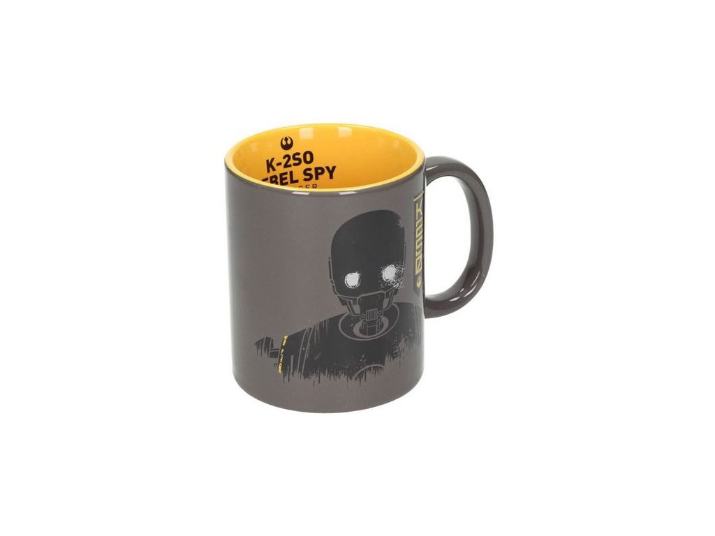 Šedo-žlutý keramický hrnek s grafickým potiskem droida K-2S0, postavy z očekávaného filmu Rogue One: A Star Wars Story.