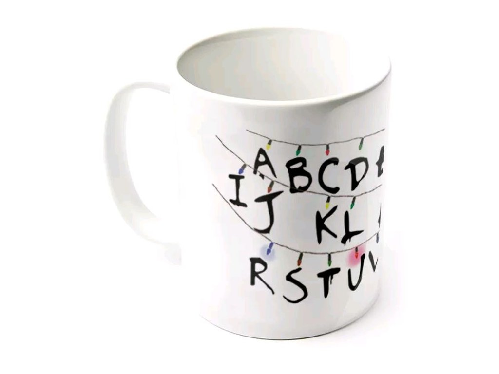Bílý keramický hrnek s grafikou seriálu Stranger Things.