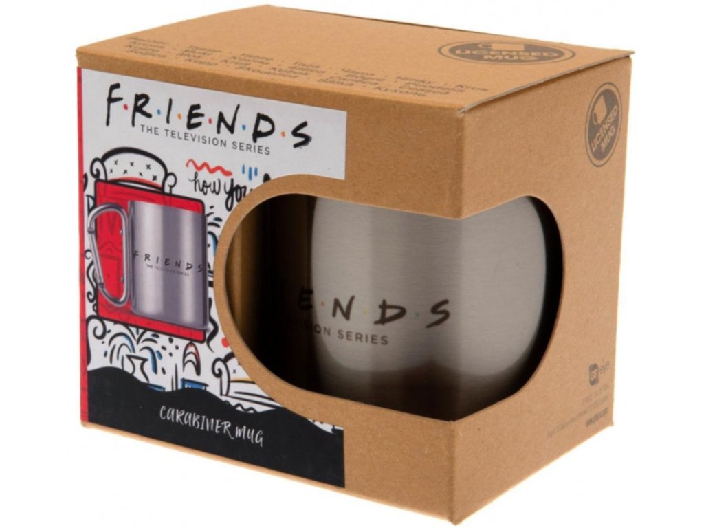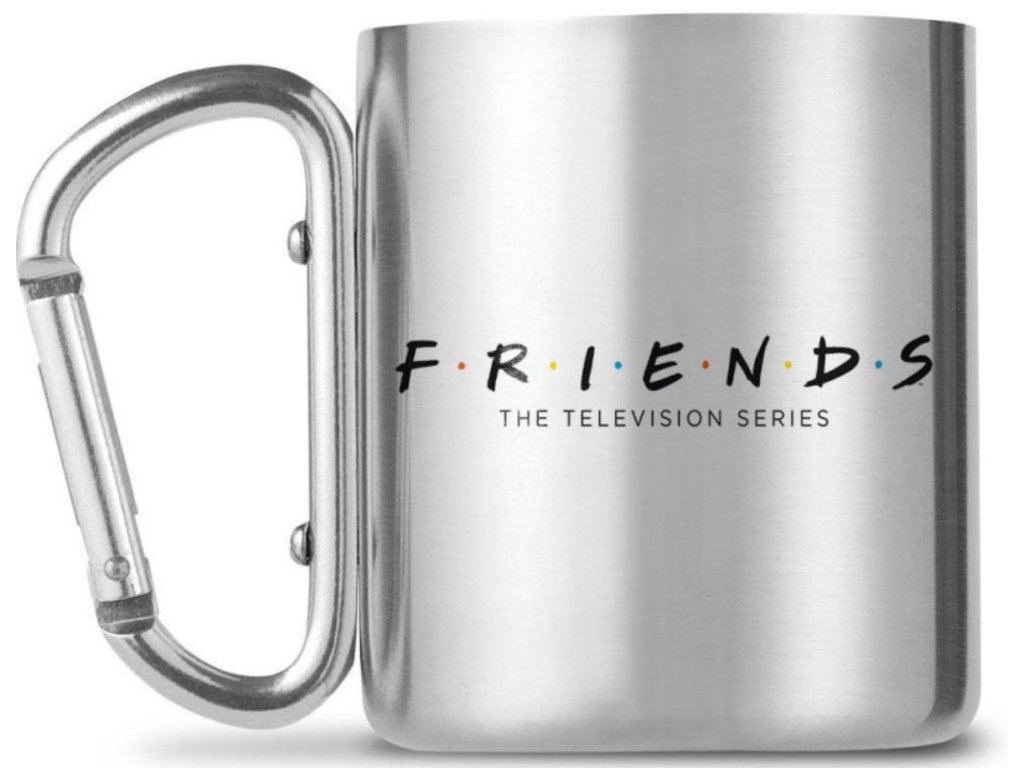 Kovový hrnek s karabinou s logem amerického televizního sitcomu Friends.
