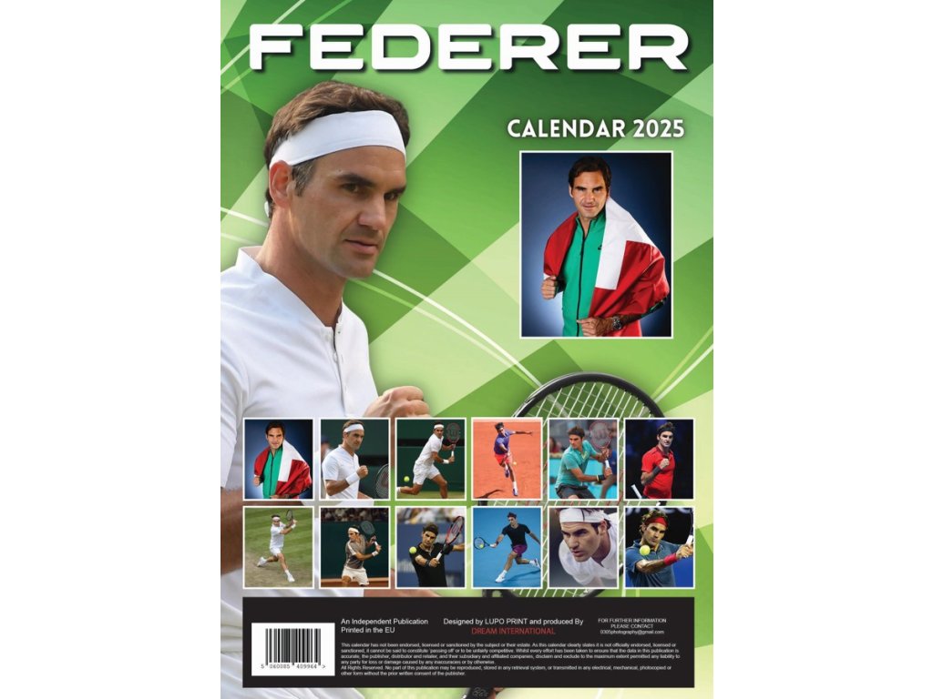 Oficiální nástěnný dvanáctiměsíční kalendář tenisty Roger Federer rok 2025.