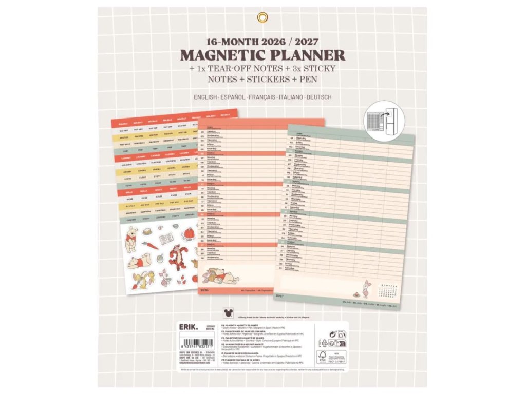 Nástěnný měsíční plánovač od září 2026 do konce prosince 2027 (16 měsíců) uspořádaný do sloupců s prostorem na poznámky. Obsahuje blok na sestavení nákupního seznamu, 3 samolepicí bloky na poznámky, 1 arch samolepek a 1 psací pero. Plánovač lze pověsit na drátěné pevné očko na zeď, nebo na silný magnet na lednici.