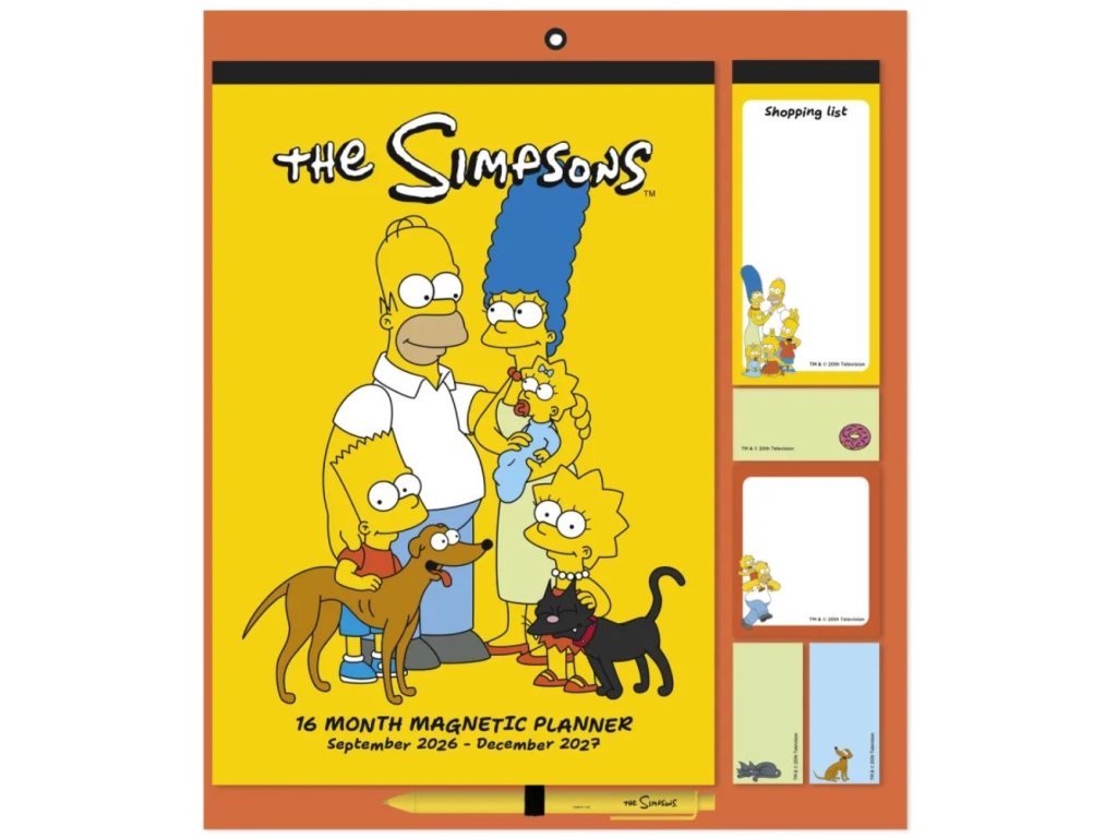 Oficiální produkt - šestnáctiměsíční plánovací kalendář a organizér na rok 2026/2027 z katalogu výrobků s licencí a grafikou postav z kresleného seriálu The Simpsons.