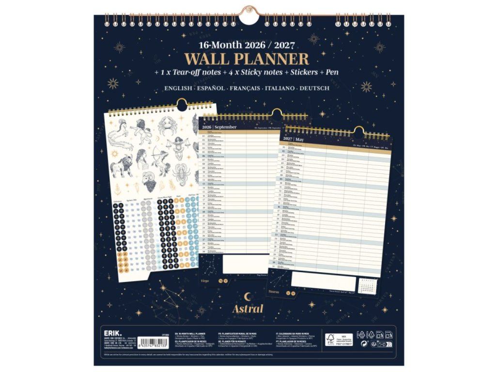 Měsíční nástěnný plánovač, od září 2026 do prosince 2027 (16 měsíců), s prostorem pro poznámky uspořádané do sloupců. Obsahuje blok na sestavení nákupního seznamu, samolepicí blok 70x75 mm a další 2 bloky 32x68 mm, 1 arch samolepek a 1 psací pero. Plánovač obsahuje očko na pověšení.