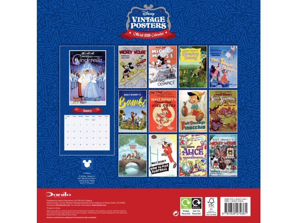 1. Dvanáctiměsíční nástěnný kalendář čtvercového square formátu (30,5 x 30,5 cm) s celkem 13 grafickými obrázky plakátů klasických animovaných filmů studia Disney.