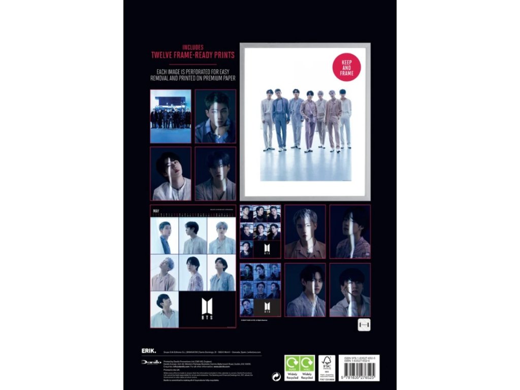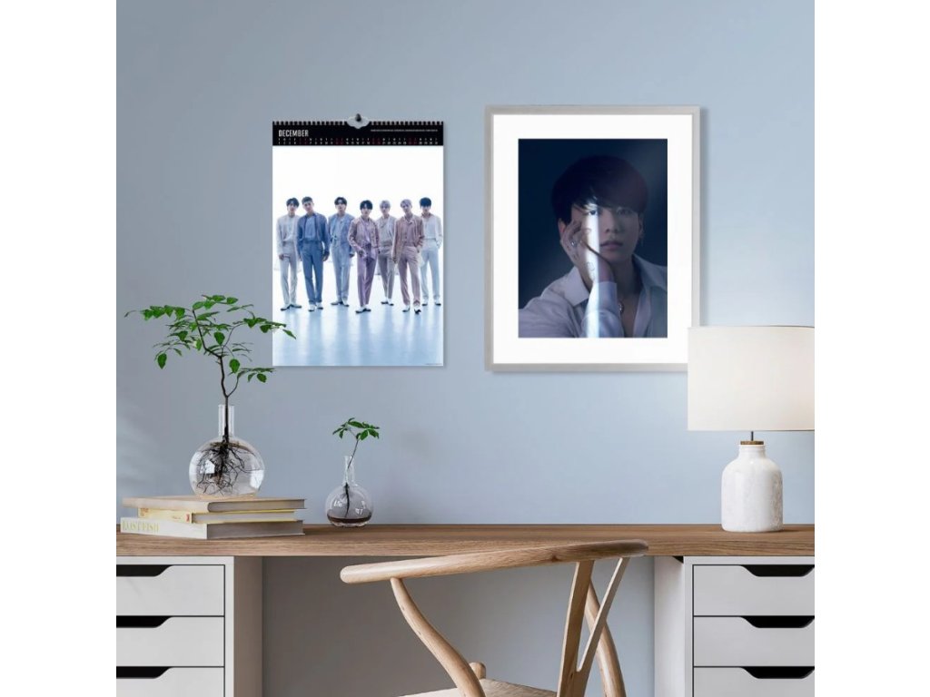 Exklusivní dvanáctiměsíční nástěnný kalendář A3 formátu (29,7 x 42 cm) s celkem 13 oficiálními plakátovými obrázky a fotografiemi korejské hudební skupiny BTS.