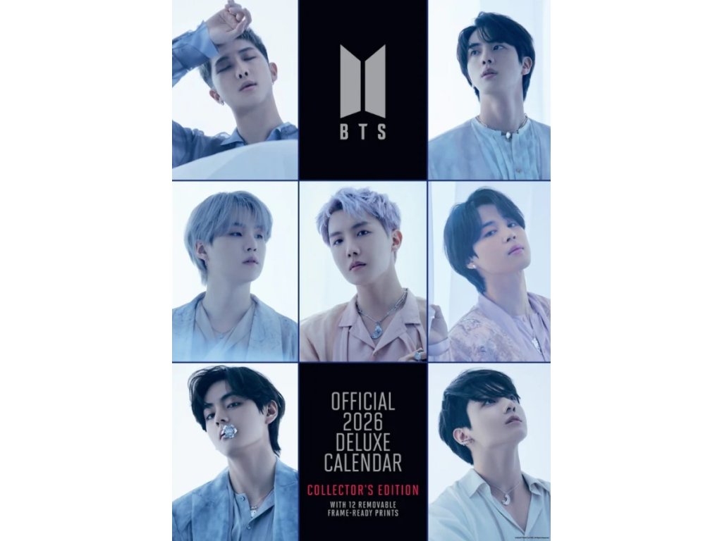 Oficiální produkt - exklusivní dvanáctiměsíční nástěnný kalendář na rok 2026 s licencí chlapecké hudební skupiny BTS.
