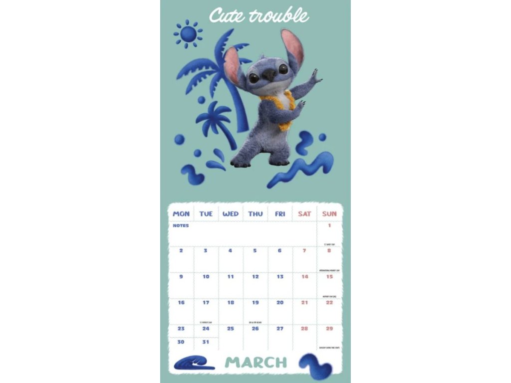 Oficiální produkt - nástěnný dvanáctiměsíční kalendář s licencí studia Disney k animovanému filmu Lilo and Stitch na rok 2026.