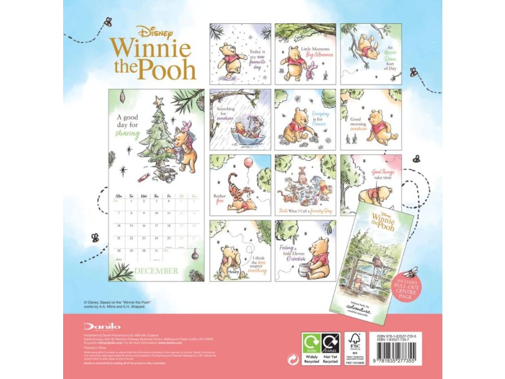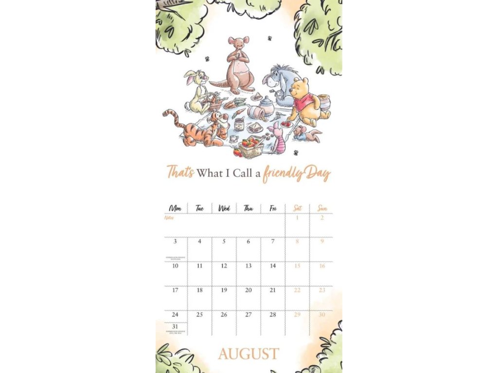Nástěnný kalendář čtvercového square formátu (30,5 x 30,5 cm), s celkem 13 obrázky postaviček z pohádky Medvídek Pú.