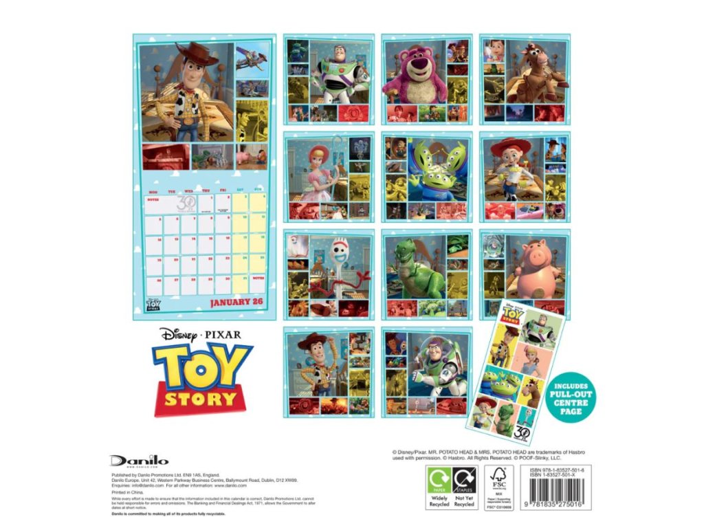 Dvanáctiměsíční nástěnný kalendář čtvercového square formátu (30,5 x 30,5 cm) s celkem 13 fotografiemi a obrázky s postavičkami ze slavné animované dětské pohádky Toy Story.