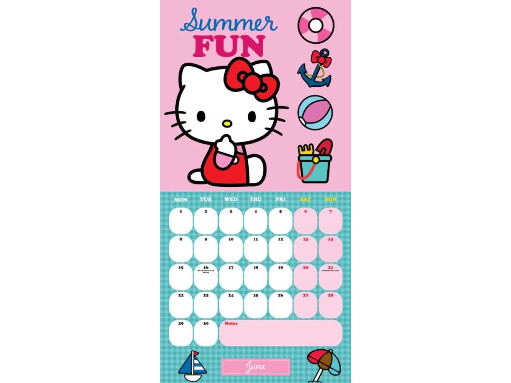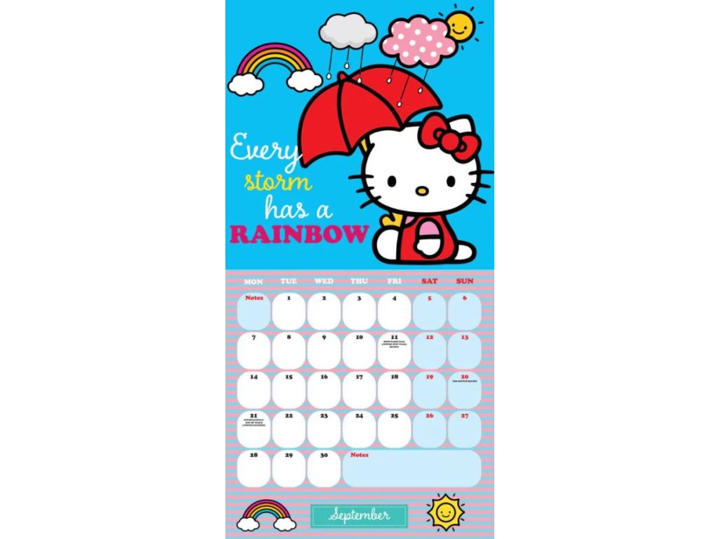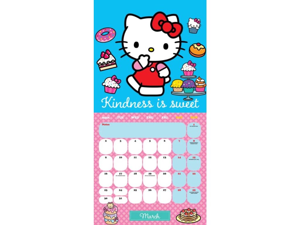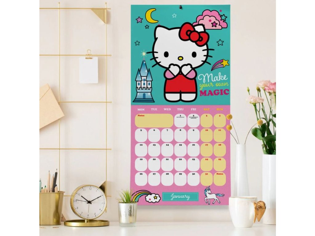 Oficiální nástěnný dvanáctiměsíční kalendář na rok 2026 s licencí populární kreslené kočky Hello Kitty.