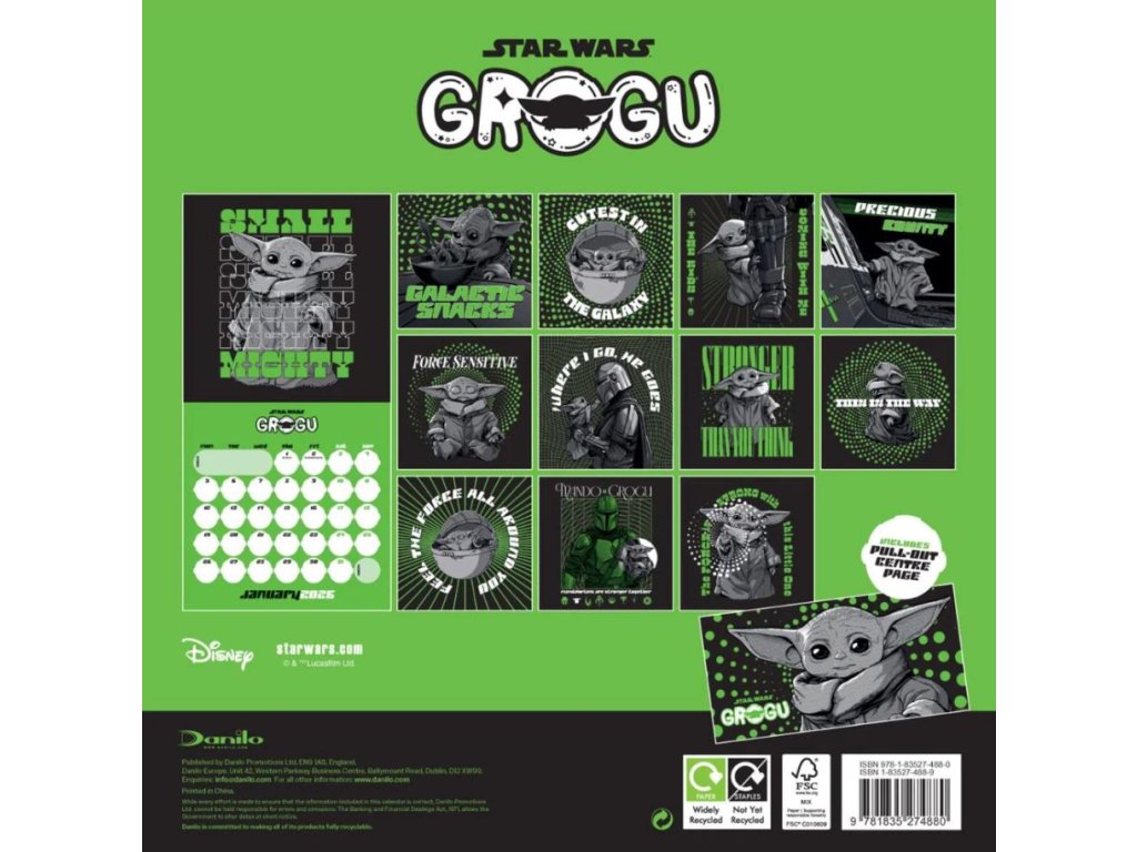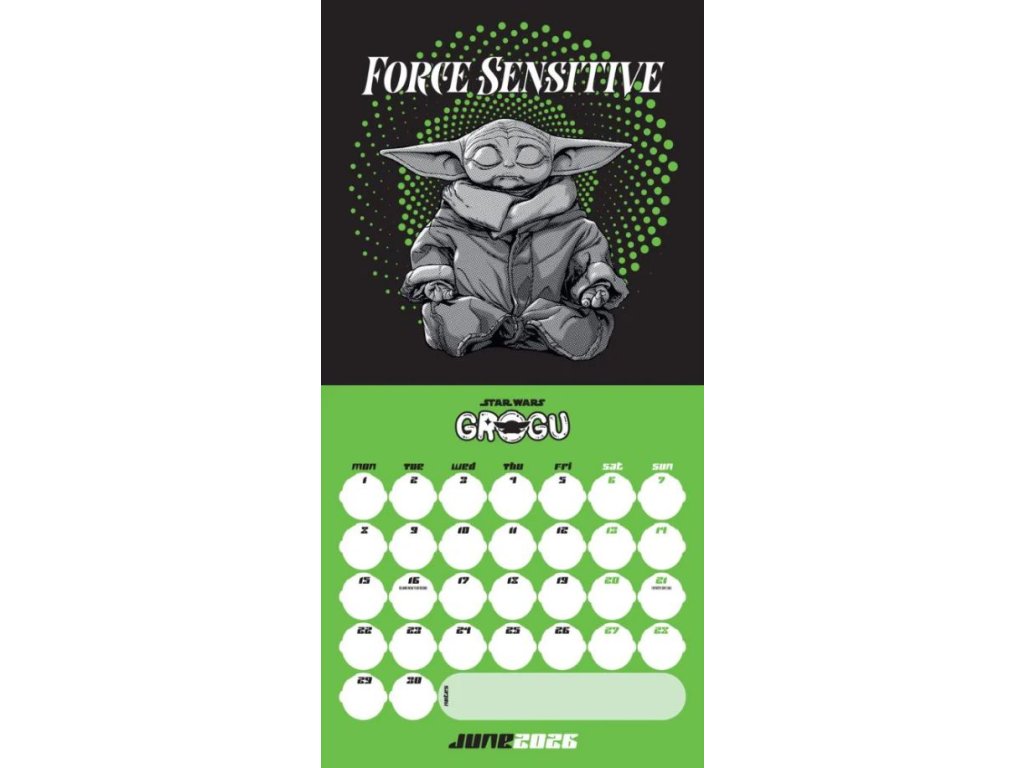 Dvanáctiměsíční nástěnný kalendář čtvercového square formátu (30,5 x 30,5 cm) s celkem 13 obrázky z televizního seriálu The Mandalorian a malého roztomilého Grogu (The Child Yody). Vedle snímků jsou také slavné citace a spousta místa pro všechny vaše záznamy schůzek a poznámky v roce 2026.