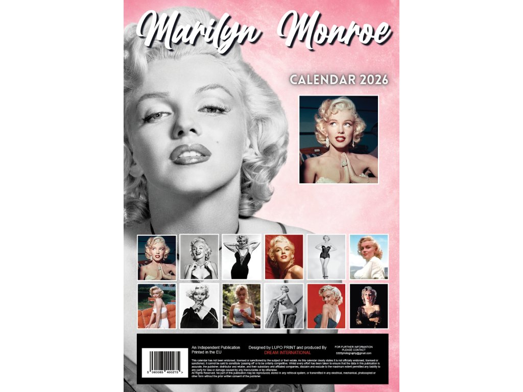 Exklusivní dvanáctiměsíční nástěnný kalendář A3 formátu (29,7 x 42 cm) s celkem 13 plakátovými obrázky a fotografiemi herečky Marilyn Monroe.