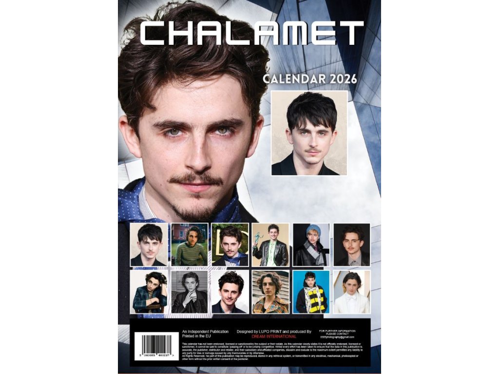 Oficiální produkt - exklusivní dvanáctiměsíční nástěnný kalendář na rok 2026 s fotografiemi populárního televizního herce Timothée Chalamet.
