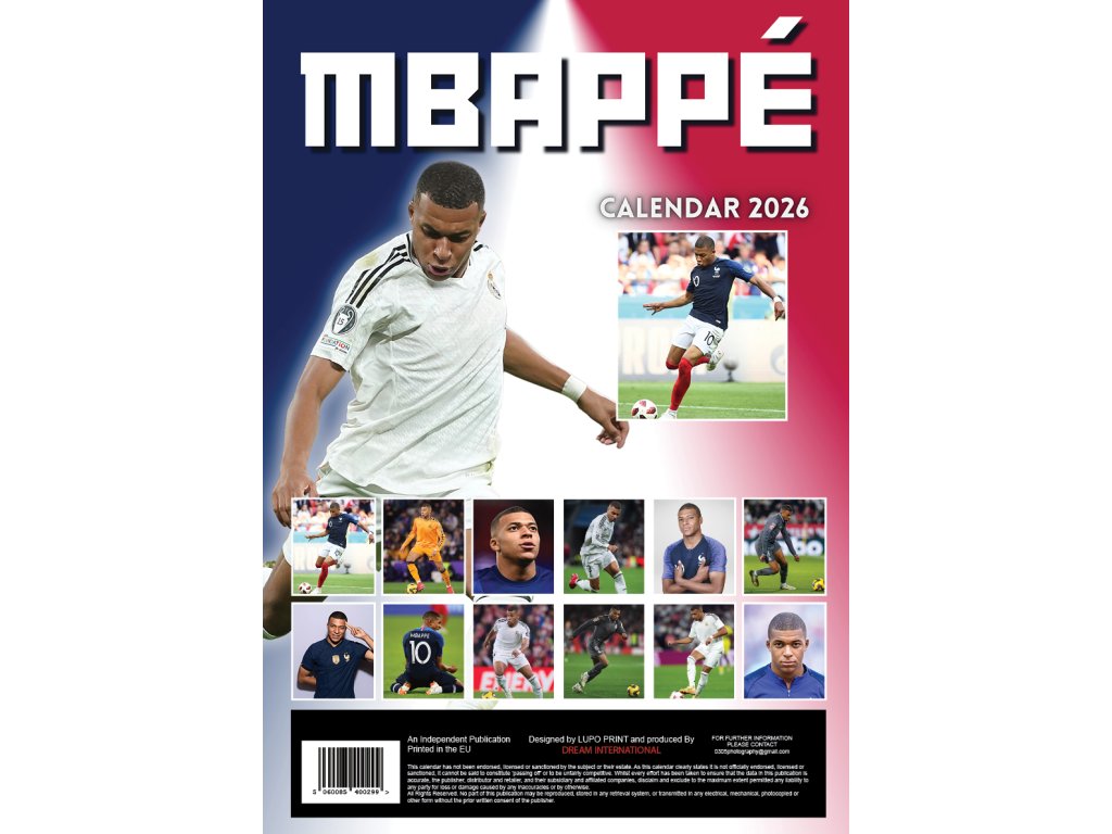 Exklusivní dvanáctiměsíční nástěnný kalendář A3 formátu (29,7 x 42 cm) s celkem 13 plakátovými obrázky a fotografiemi fotbalisty Kyliana Mbappého.