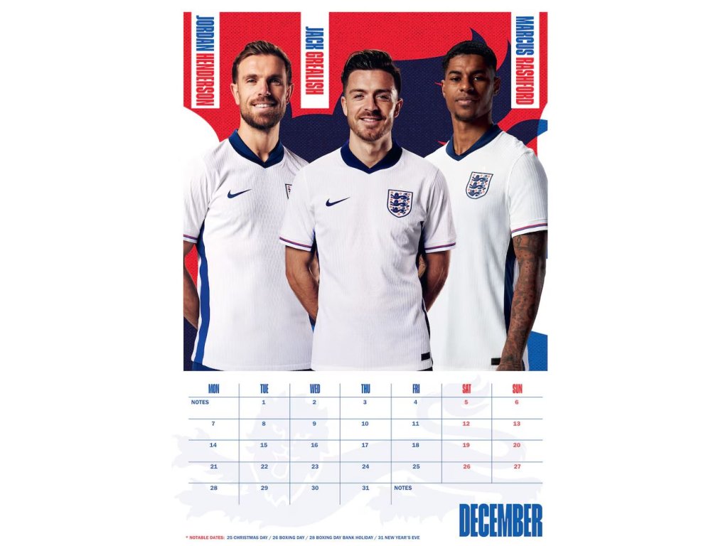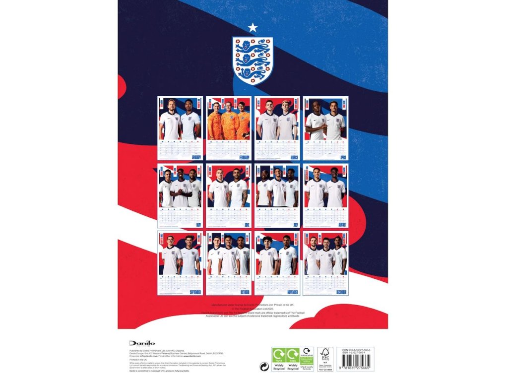 Dvanáctiměsíční nástěnný kalendář A3 formátu (29,7 x 42 cm) s celkem 13 oficiálními autorizovanými fotografiemi hráčů anglické reprezentace.