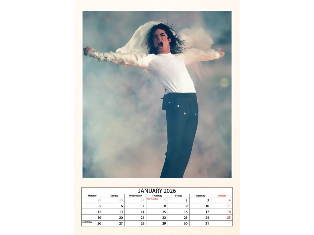 Oficiální produkt - nástěnný dvanáctiměsíční kalendář zpěváka Michael Jackson na rok 2026.